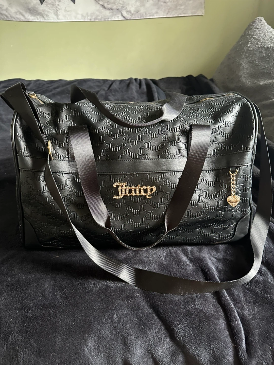Selling a stylish Juicy Couture duffle bag in black. The bag features an embossed design and the Juicy logo in gold. It has both handles and a shoulder strap for easy carrying. The interior is lined with Juicy Couture print. Perfect for travel or gym!