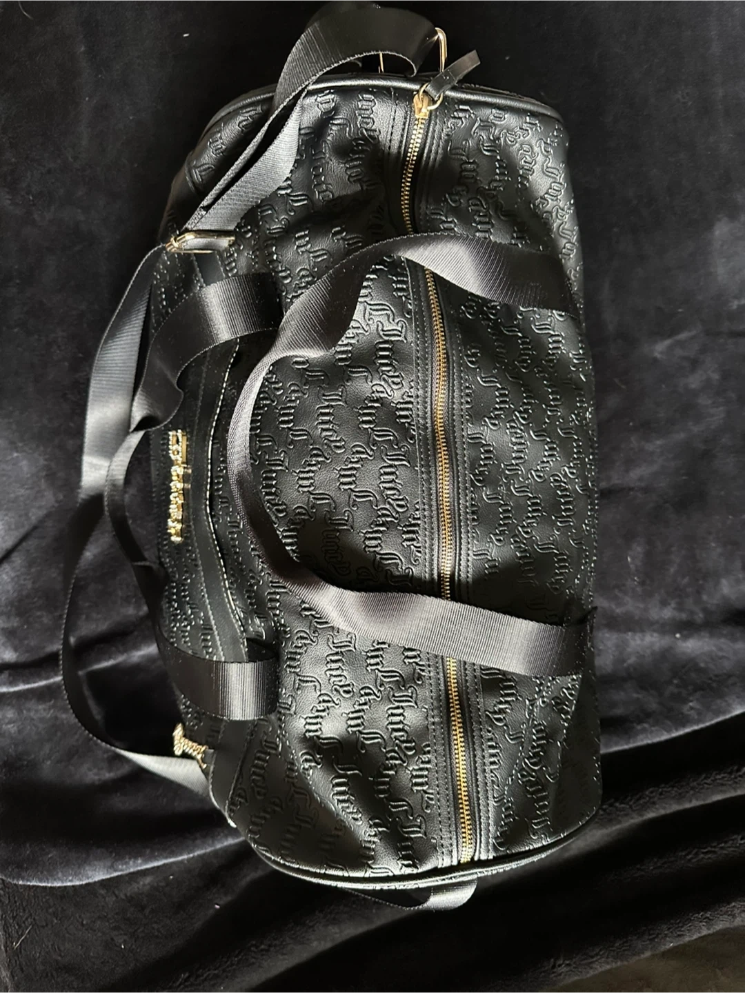 Selling a stylish Juicy Couture duffle bag in black. The bag features an embossed design and the Juicy logo in gold. It has both handles and a shoulder strap for easy carrying. The interior is lined with Juicy Couture print. Perfect for travel or gym!