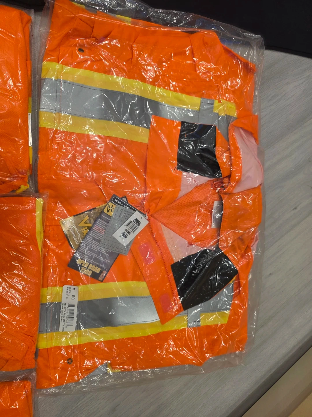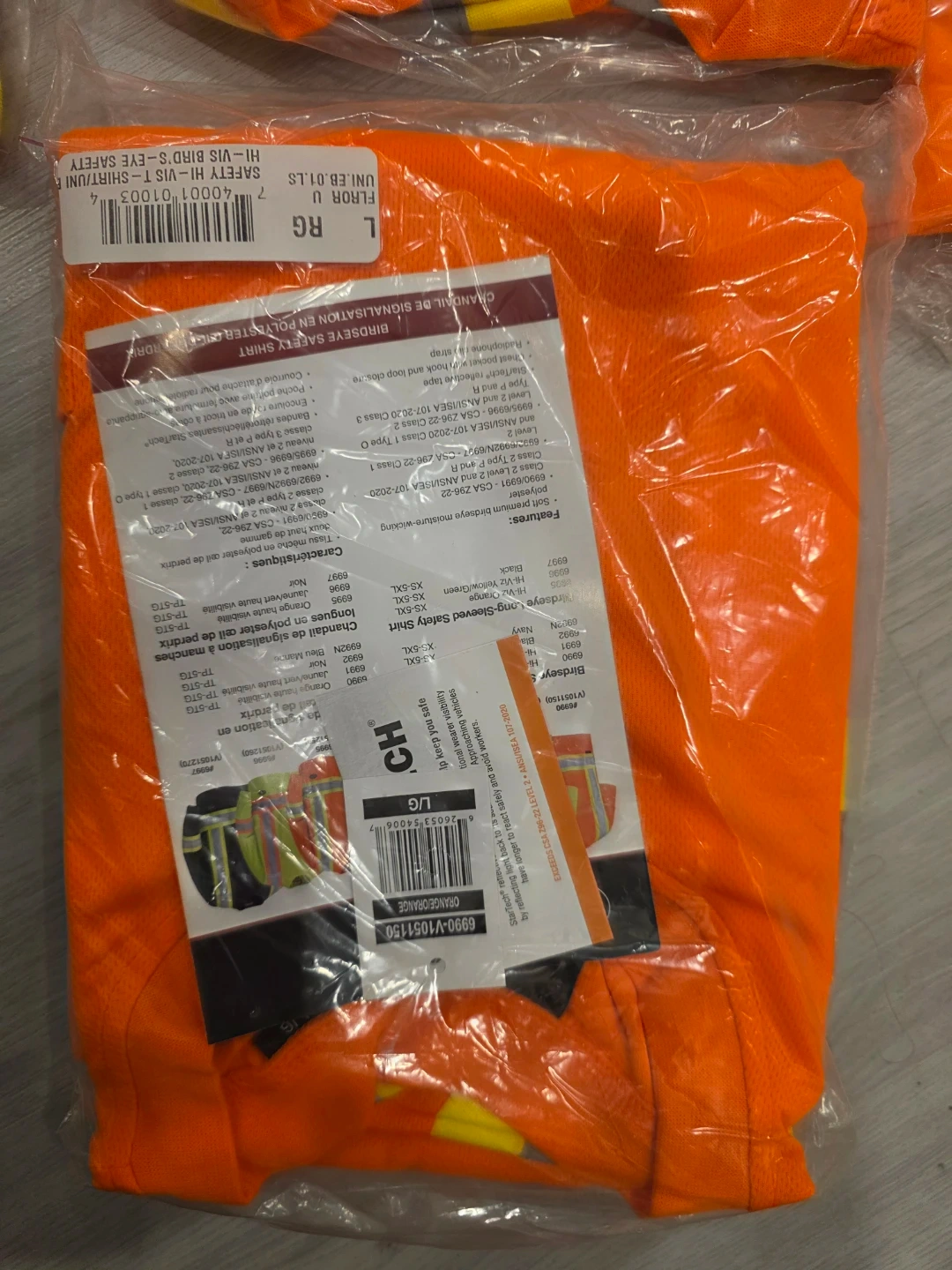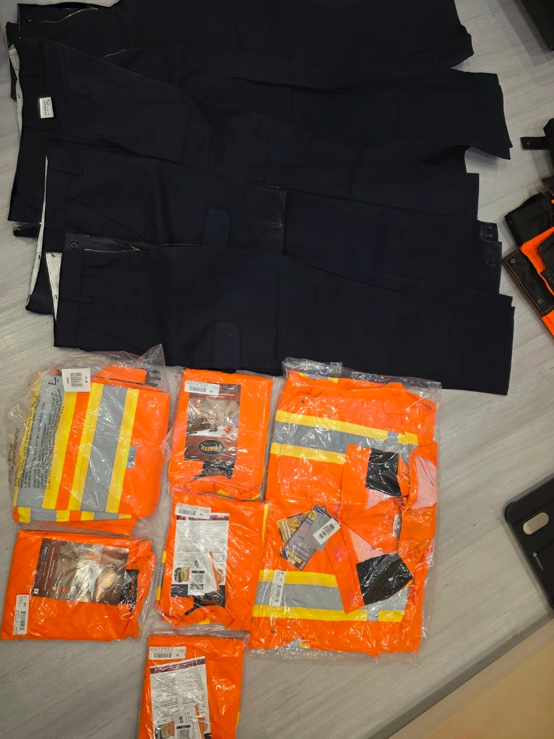 Includes several orange Hi-Vis short-sleeve safety shirts in size L and several navy work pants in size 32W x 34L. Shirts are made of polyester. Pants are made of a durable fabric.