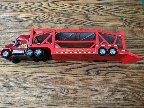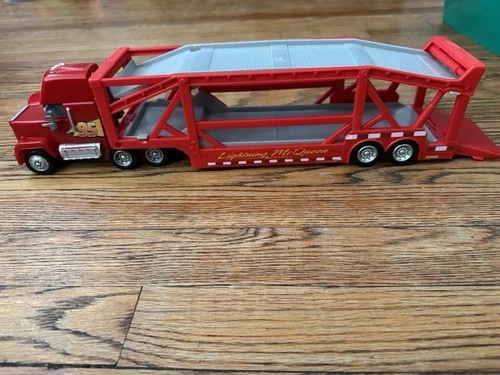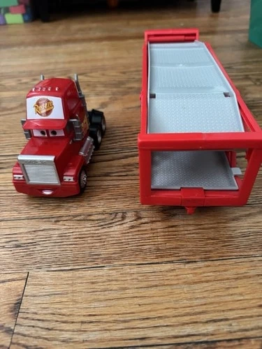 This is the Disney Pixar Cars Mack hauler truck, a toy vehicle modeled after the iconic Mack truck from the popular Cars movie franchise. It features the beloved character from the Disney Pixar Cars series and is a must-have for fans of the movies. Its detailed design and high-quality construction make it a perfect addition to any toy vehicle collection, allowing kids to recreate their favorite scenes from the films or display it as a unique collectible piece.