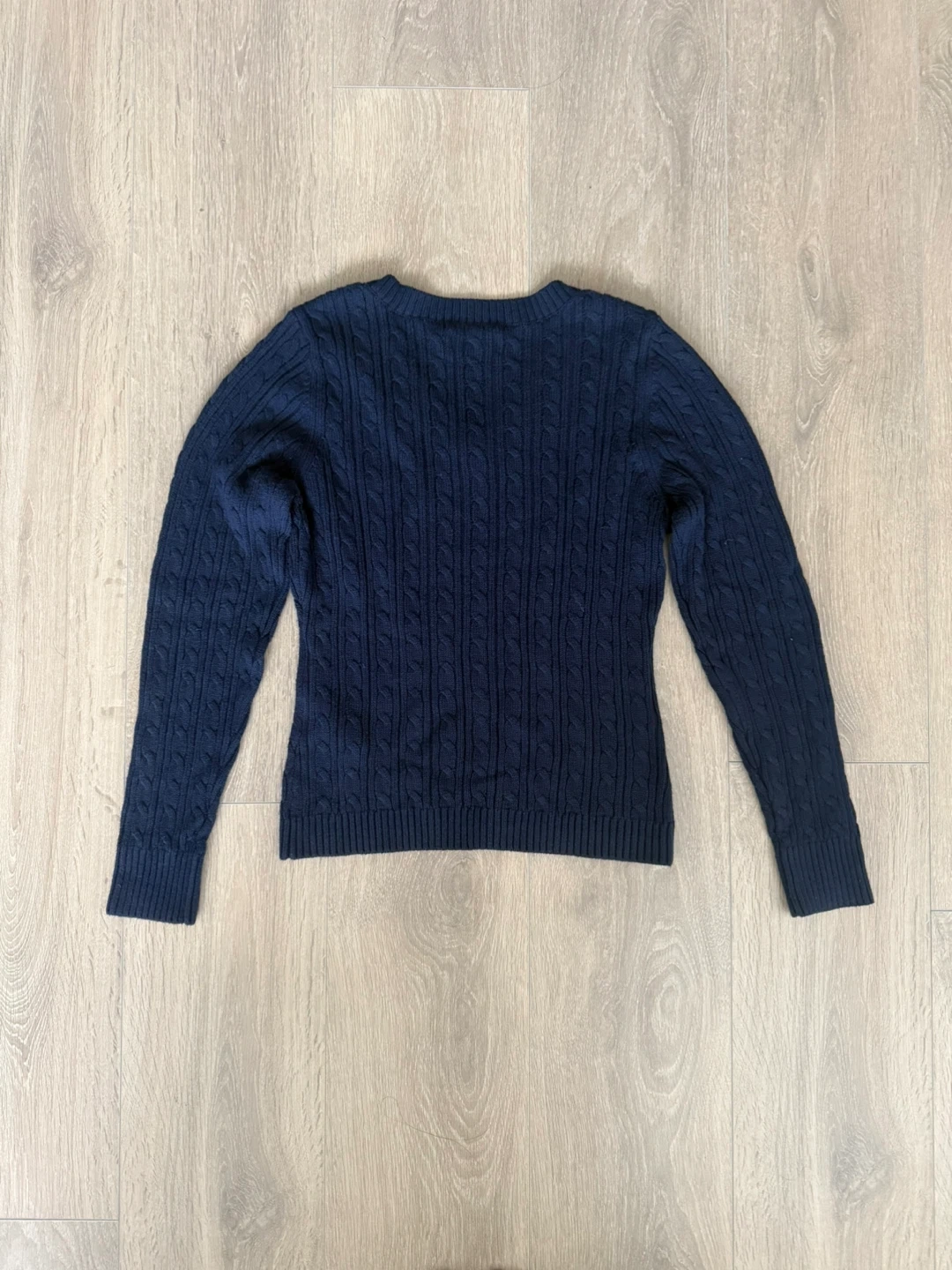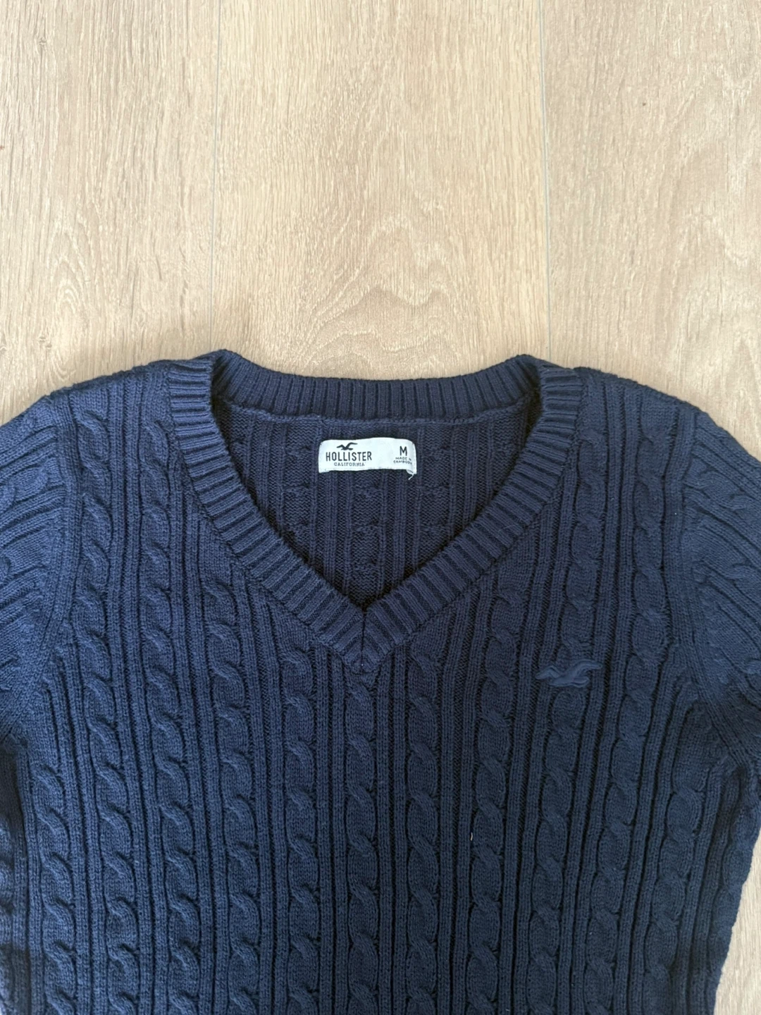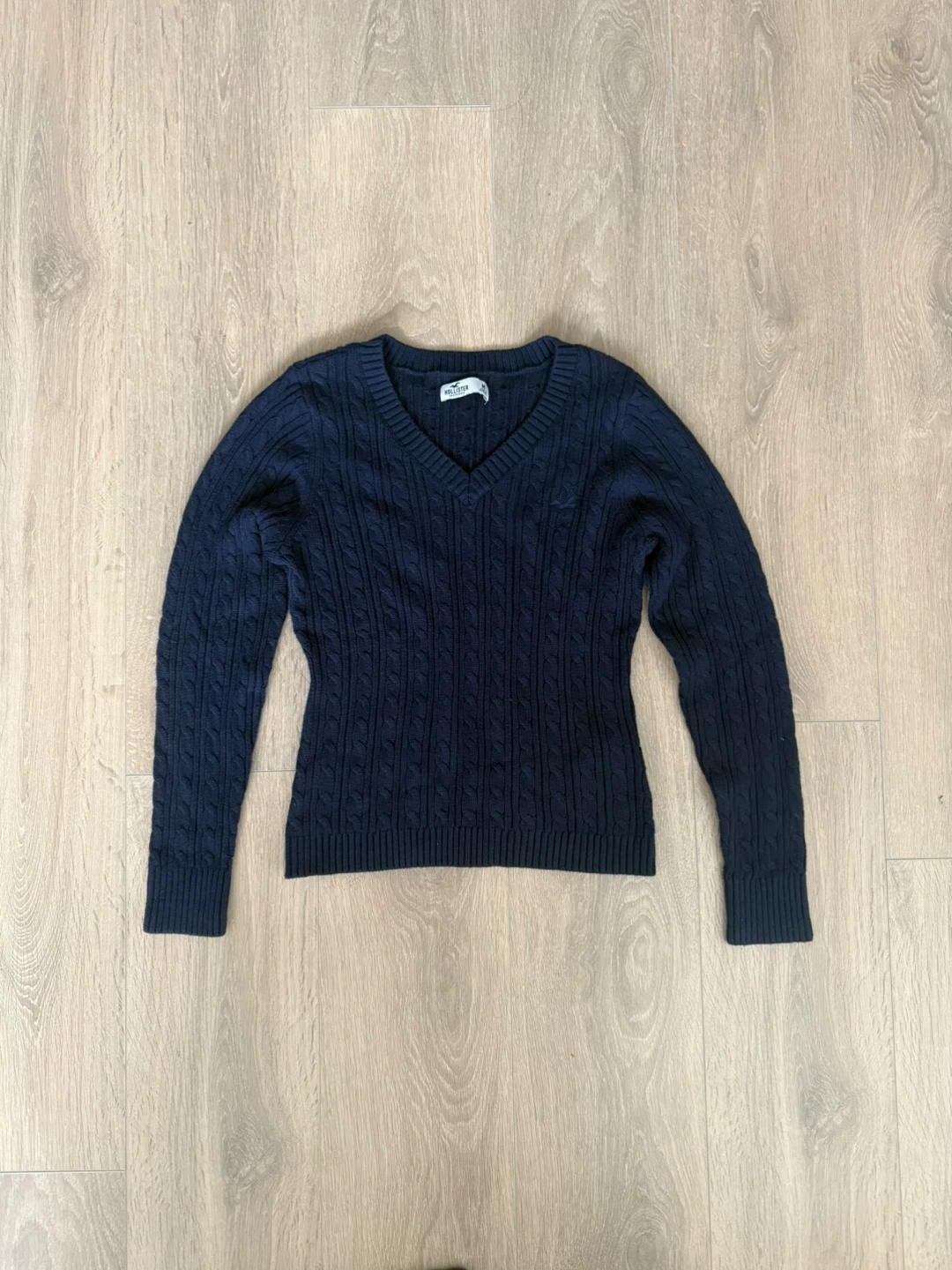 This is a navy blue cable knit V-neck sweater from Hollister. It's a size womens medium. Only worn a few times, Im selling since Im a student! I do discounts on bundles!!