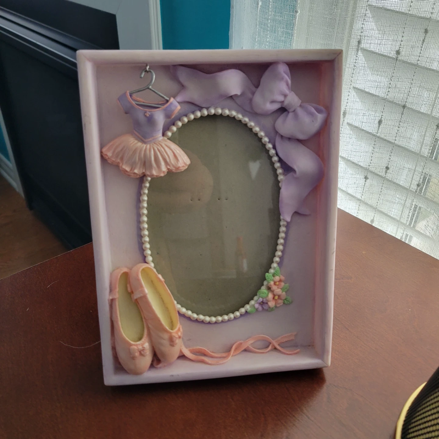 Sweet ballet dancer themed photo frame by Russ Berrie. Features a tutu, ballet slippers, and a bow design. Perfect for a little one's room or any dance enthusiast!