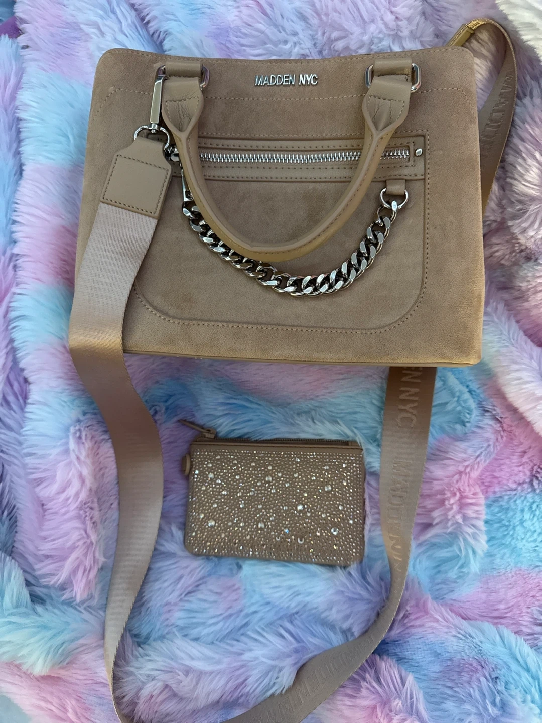 This Madden NYC tote bag is made of tan suede material. It includes a matching coin pouch with rhinestone embellishments. The bag has a chain detail and a shoulder strap.