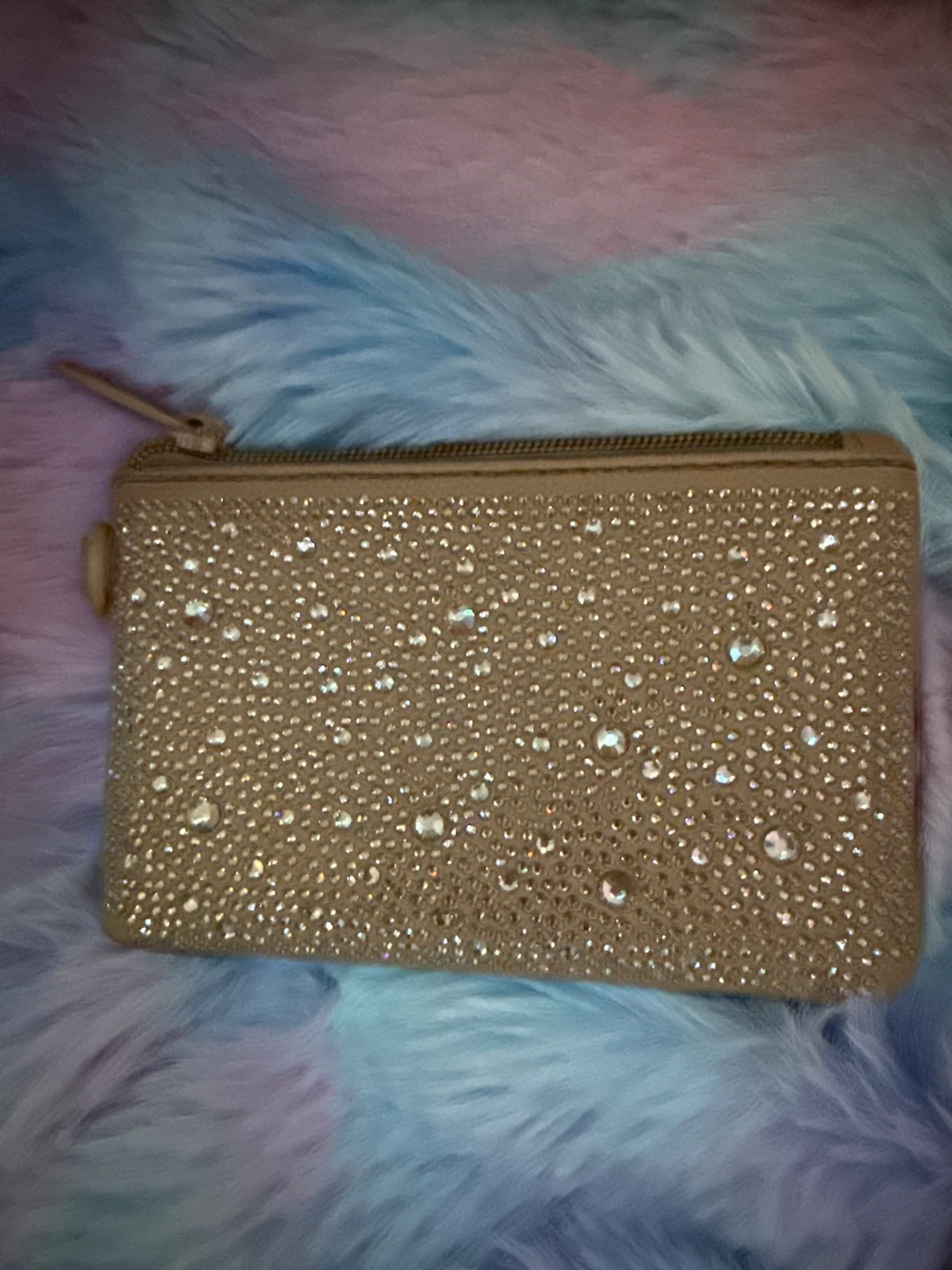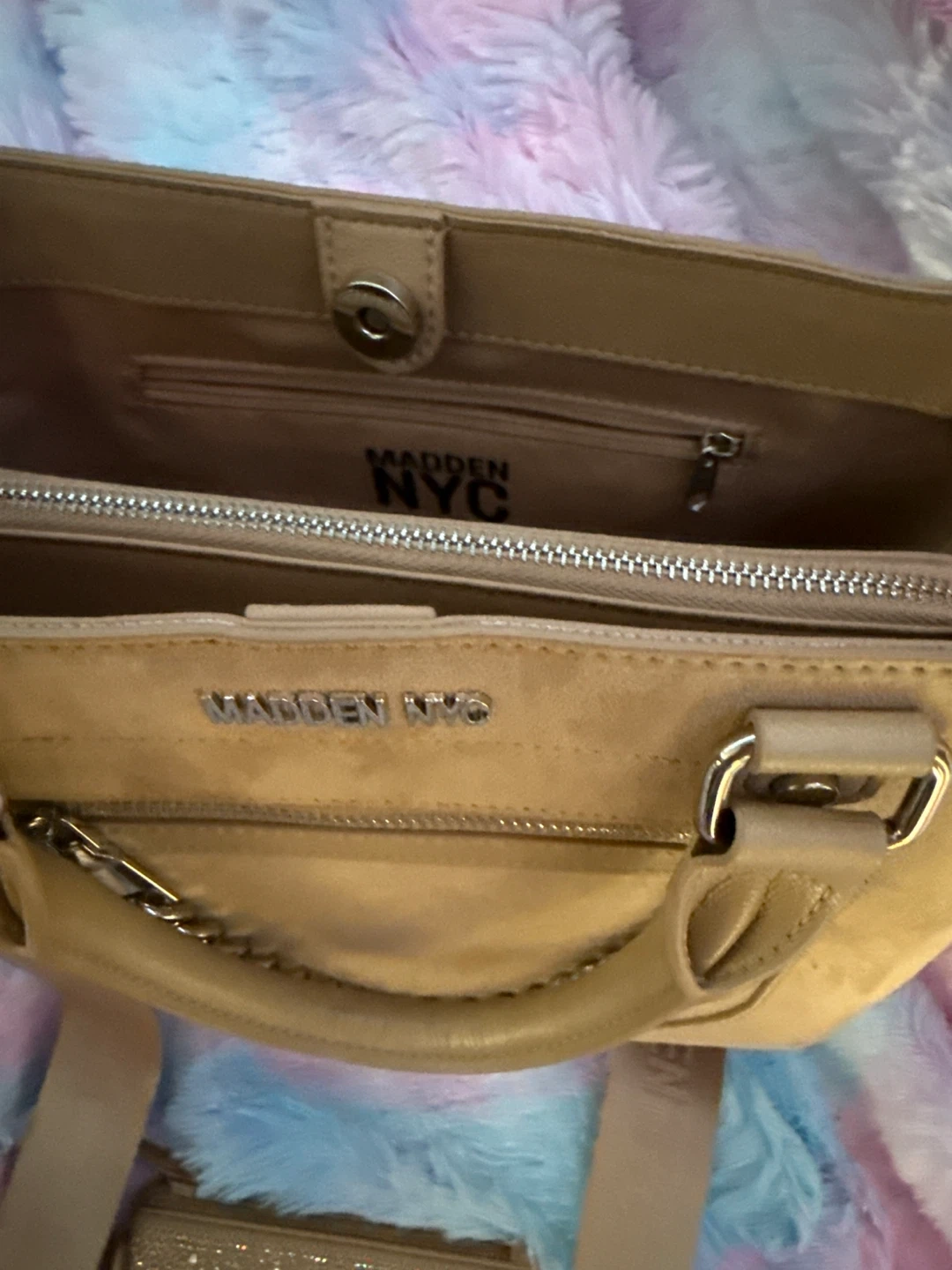 This Madden NYC tote bag is made of tan suede material. It includes a matching coin pouch with rhinestone embellishments. The bag has a chain detail and a shoulder strap.