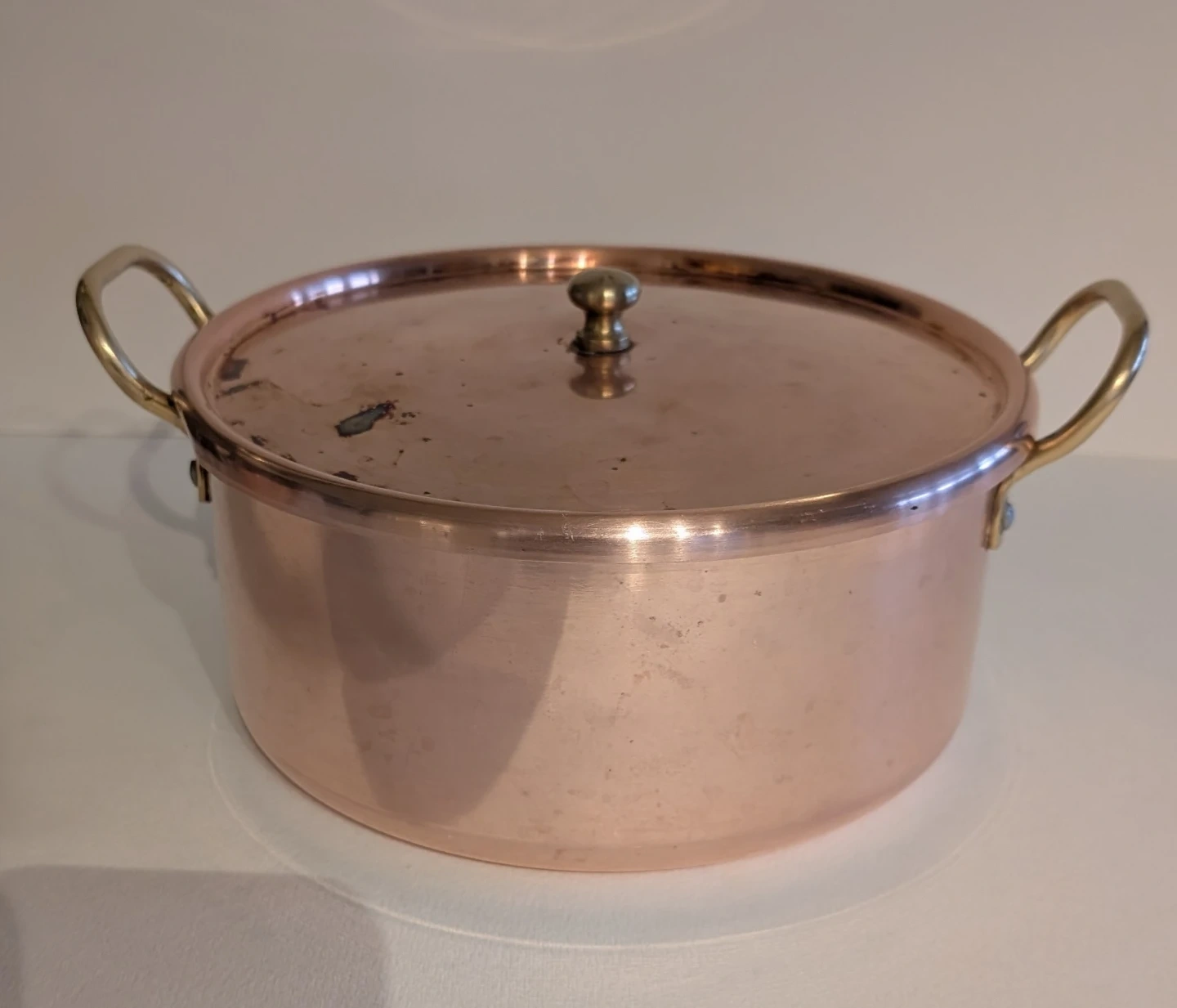 Buy & SellVintage Copper Pot with LidVintage Copper Pot with Lid$50Vintage 1960's copper pot with brass handles Dent on edge of lid as shown in photo ConditionGoodDimensions10" across including handles 4" highWHERE TO MEETRiver Street & Queen Street EastView MapSELLERverifiedClareOld Toronto44329 reviews0 chats·3 favorites·32 viewsSEND CHAT TO SELLERHi Clare! I’m interested in your listing.Hi Clare! I’m interested in your listing.Get the Karrot app to chatSign In to chat