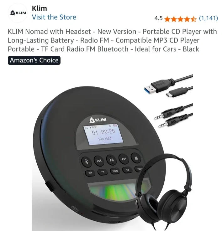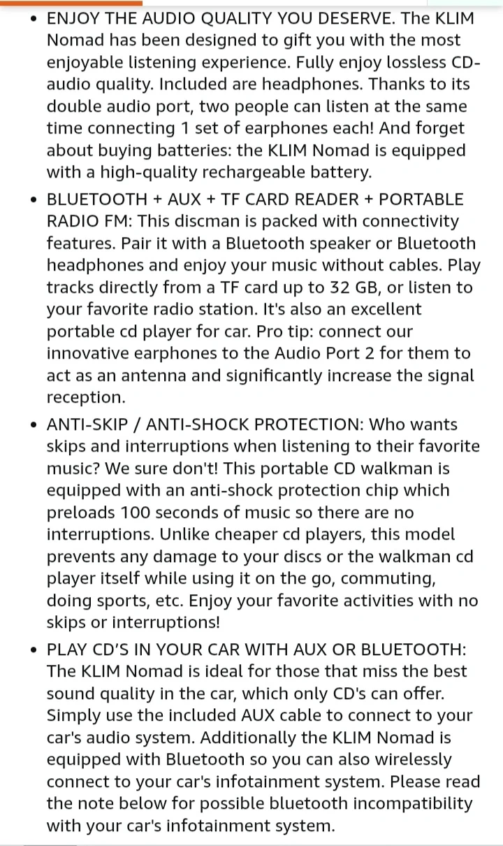 This KLIM Nomad is a portable CD player with FM/AM radio, TF card reader, and Bluetooth connectivity. It includes a headset and offers long-lasting battery life. Perfect for use in cars!