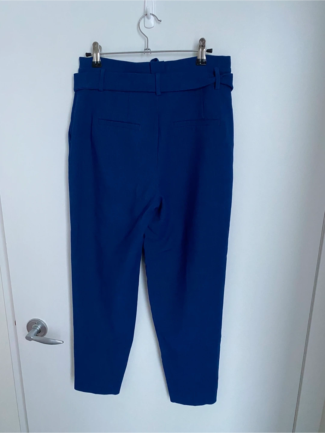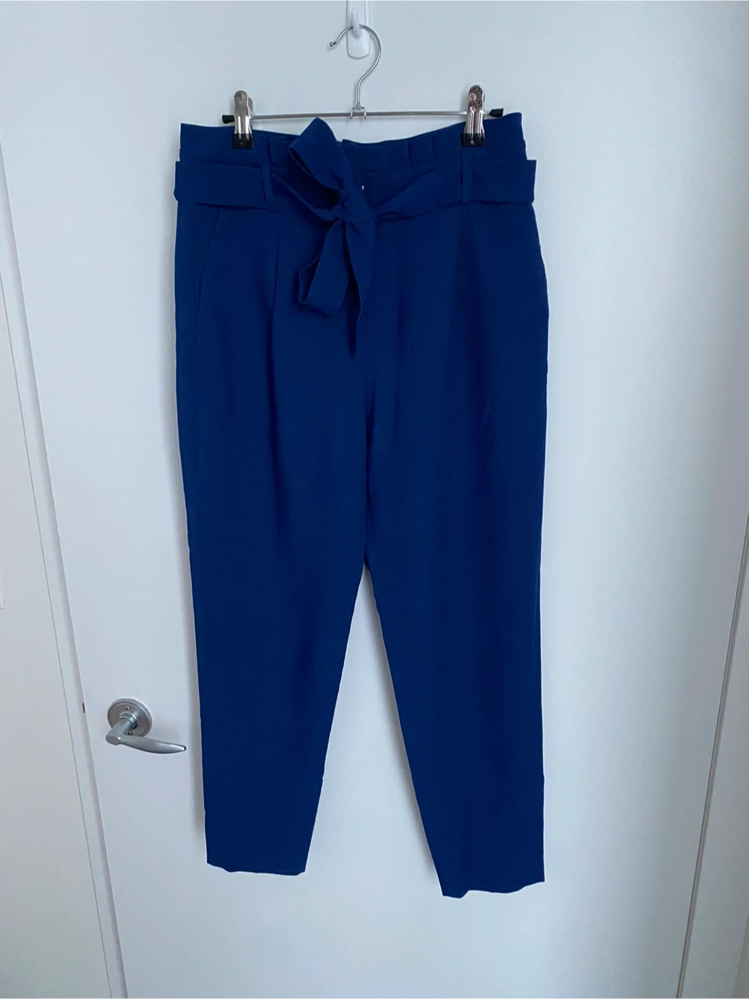 Stylish blue pants with a flattering high waist and a tie belt. Features a tapered leg and a comfortable fit. These versatile pants are a great addition for work or casual outings!