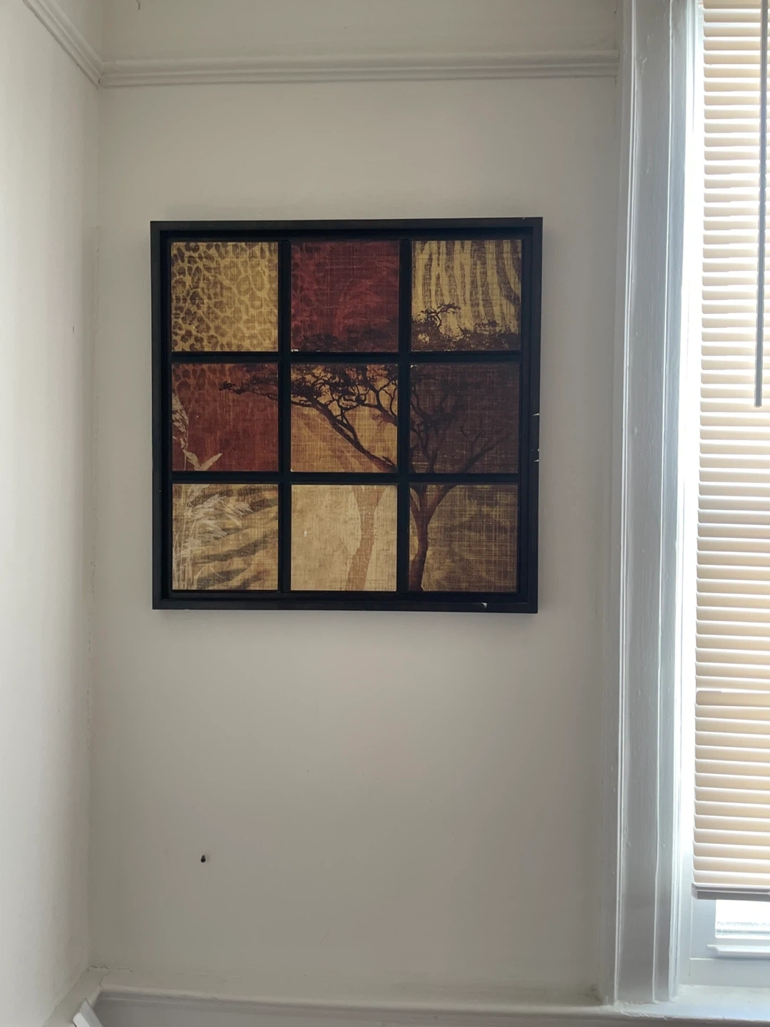 This wall art features a 3x3 grid design with African-inspired imagery, including animal prints and a tree silhouette. It's framed in black and ready to hang. It adds a touch of nature-themed decor to any room.