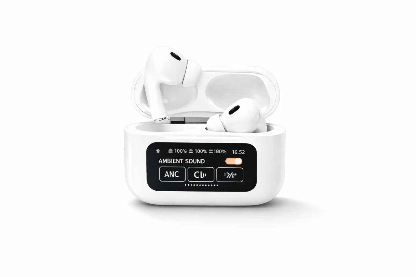 These white wireless earbuds come with a charging case. The case displays battery levels and features ambient sound, ANC, and transparency mode options. The earbuds themselves are white and designed for a comfortable fit.