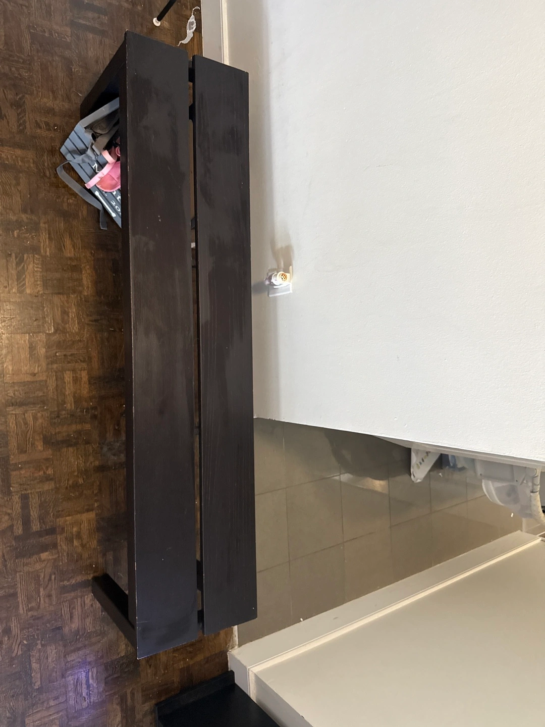 Selling a sturdy black wooden bench. It's in good condition and would be great for an entryway or as extra seating. There are some minor signs of wear on the legs, as shown in the pictures.