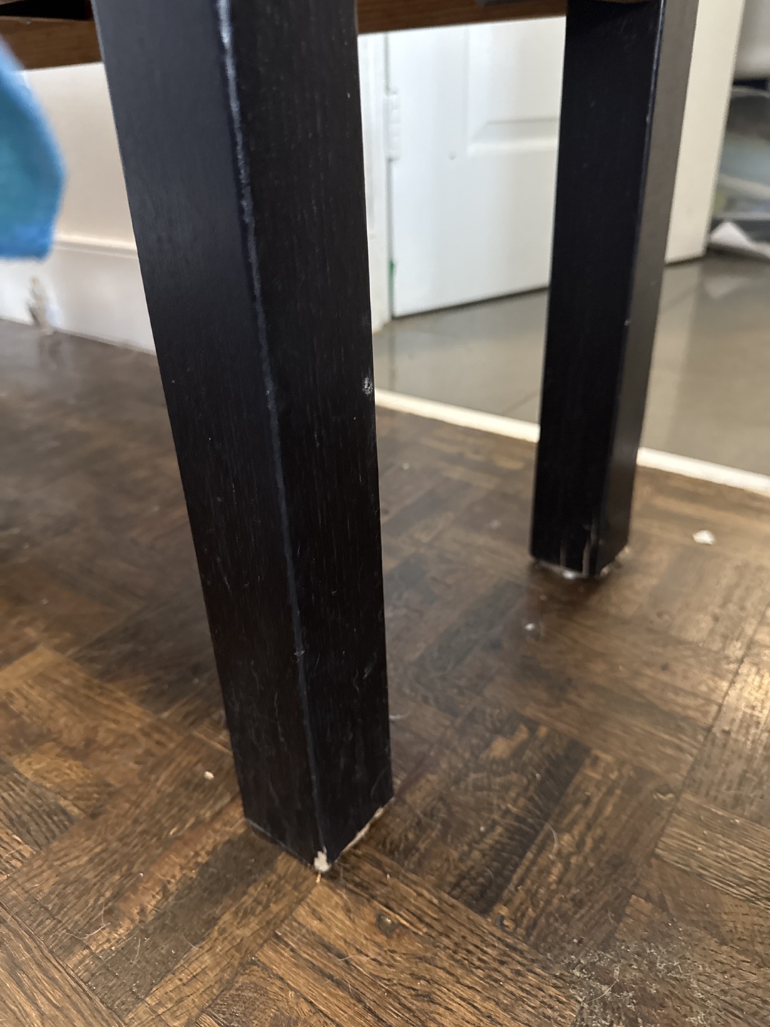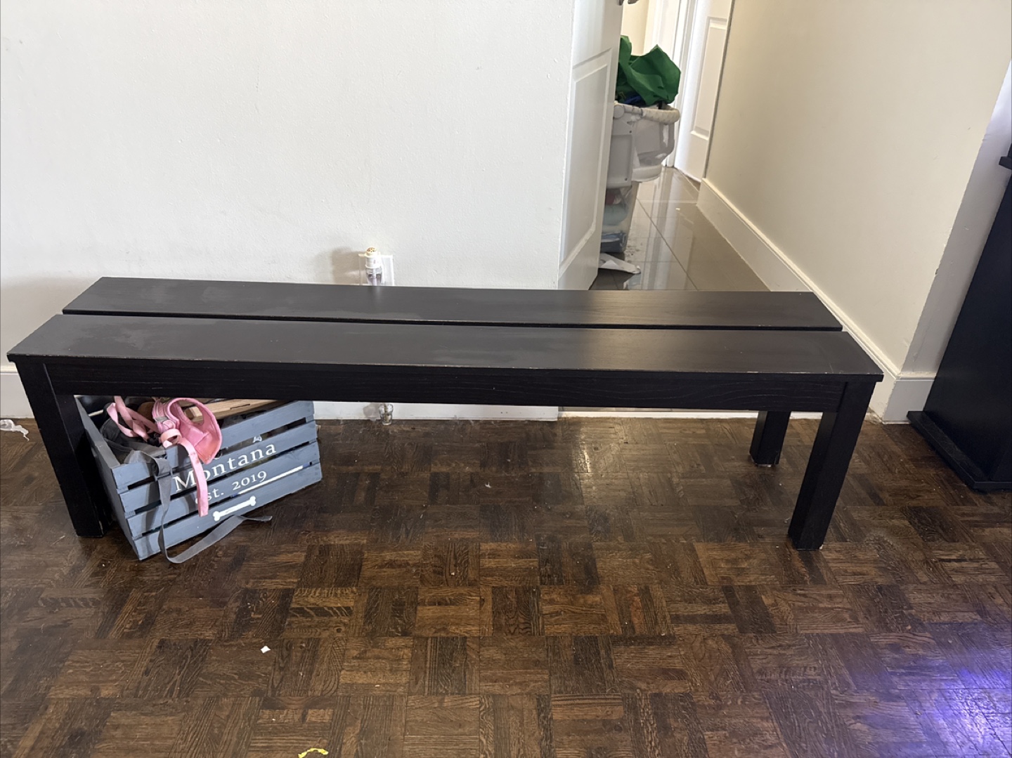 Selling a sturdy black wooden bench. It's in good condition and would be great for an entryway or as extra seating. There are some minor signs of wear on the legs, as shown in the pictures.
