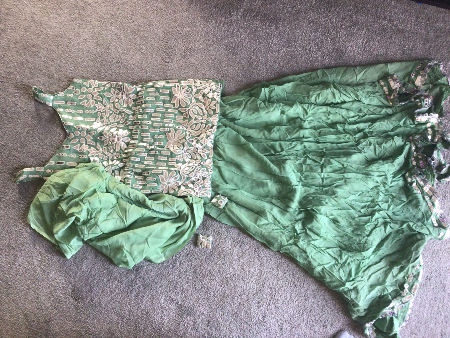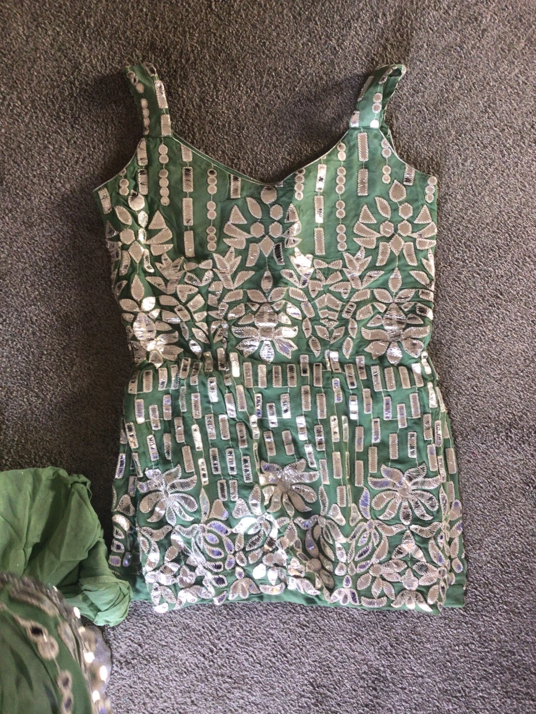 Green sleeveless dress with intricate silver floral and rectangular embellishments. Lightweight fabric. Includes dupatta.