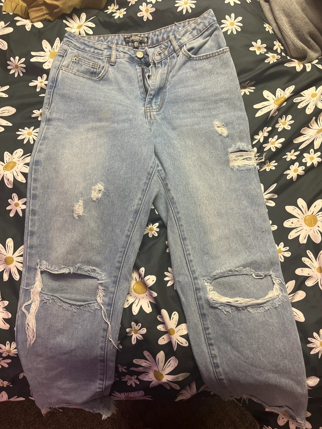 Light wash mom jeans from Missguided with ripped detailing. These jeans are a size 2 in US, petite.