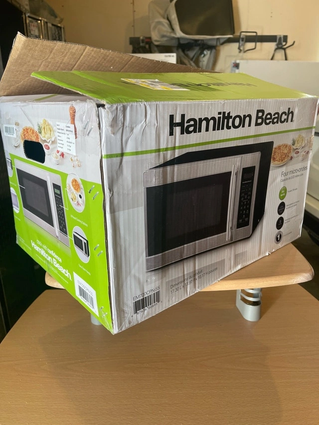 Selling a Hamilton Beach microwave, 700 watts with 10 power levels. The 0.7 cu. ft. capacity is perfect for small kitchens or office spaces. Comes in original packaging, only used 6 months! Model EM720CPNS5. Similar microwaves sell for around $70-$90.