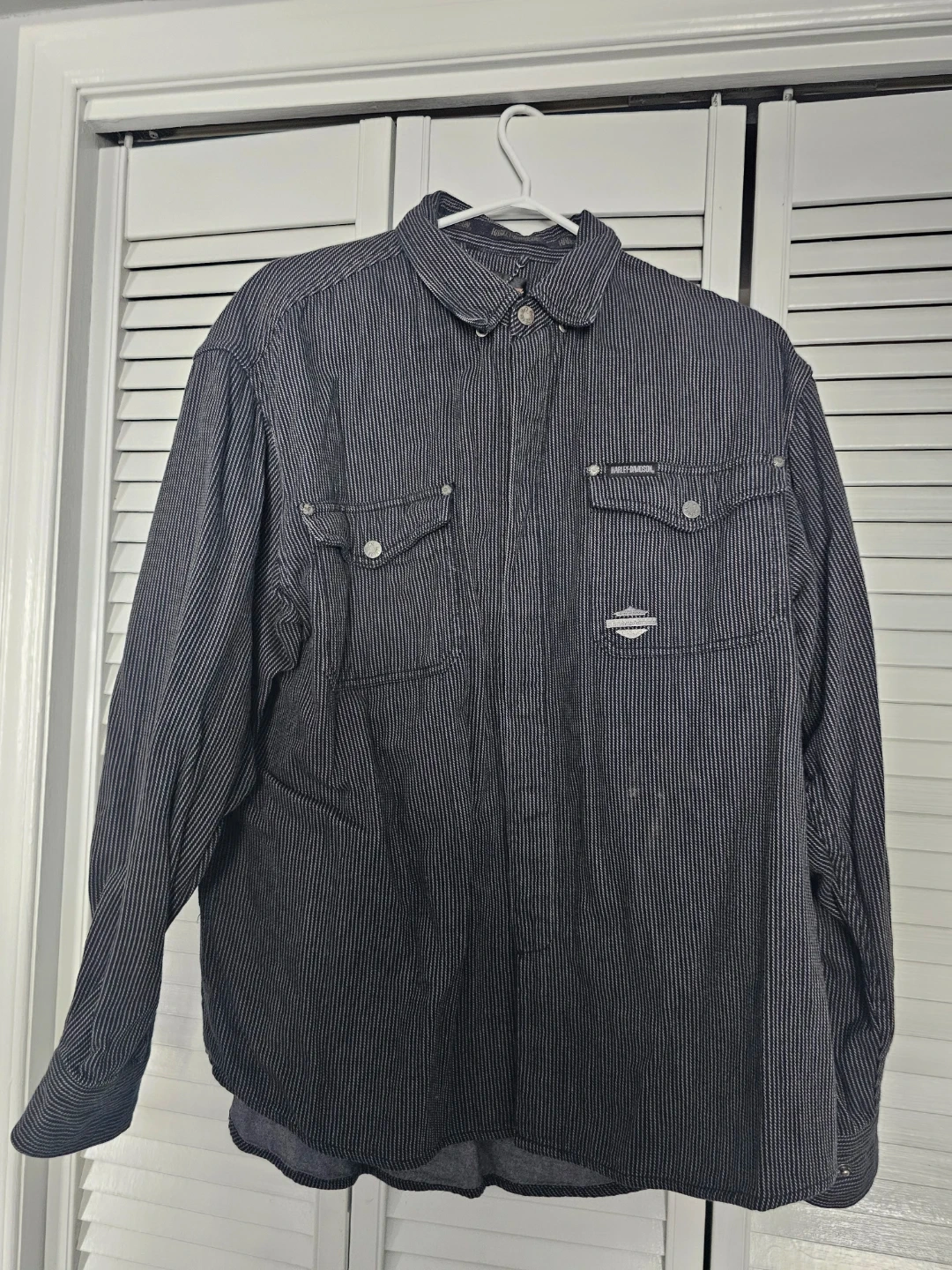 Harley-Davidson button-up shirt with a pinstripe pattern. It features two chest pockets and a classic collar. Made from a durable fabric, it's a nice piece for any fan.