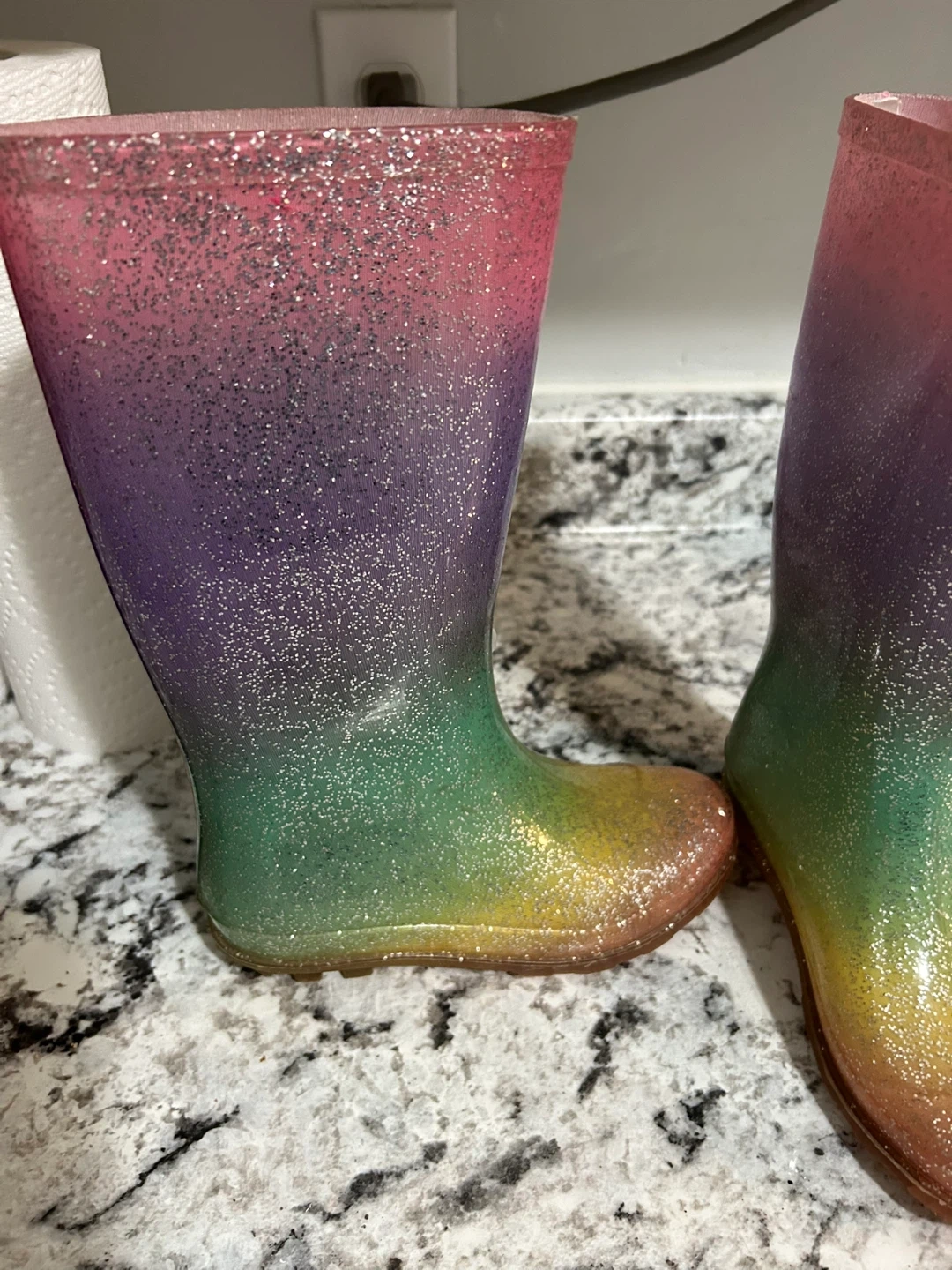 These cute rain boots feature a vibrant rainbow gradient with glitter details throughout. They're made of waterproof material, perfect for splashing in puddles. The sturdy soles offer good grip. A fun addition for any kid's rainy day adventures! Size 13