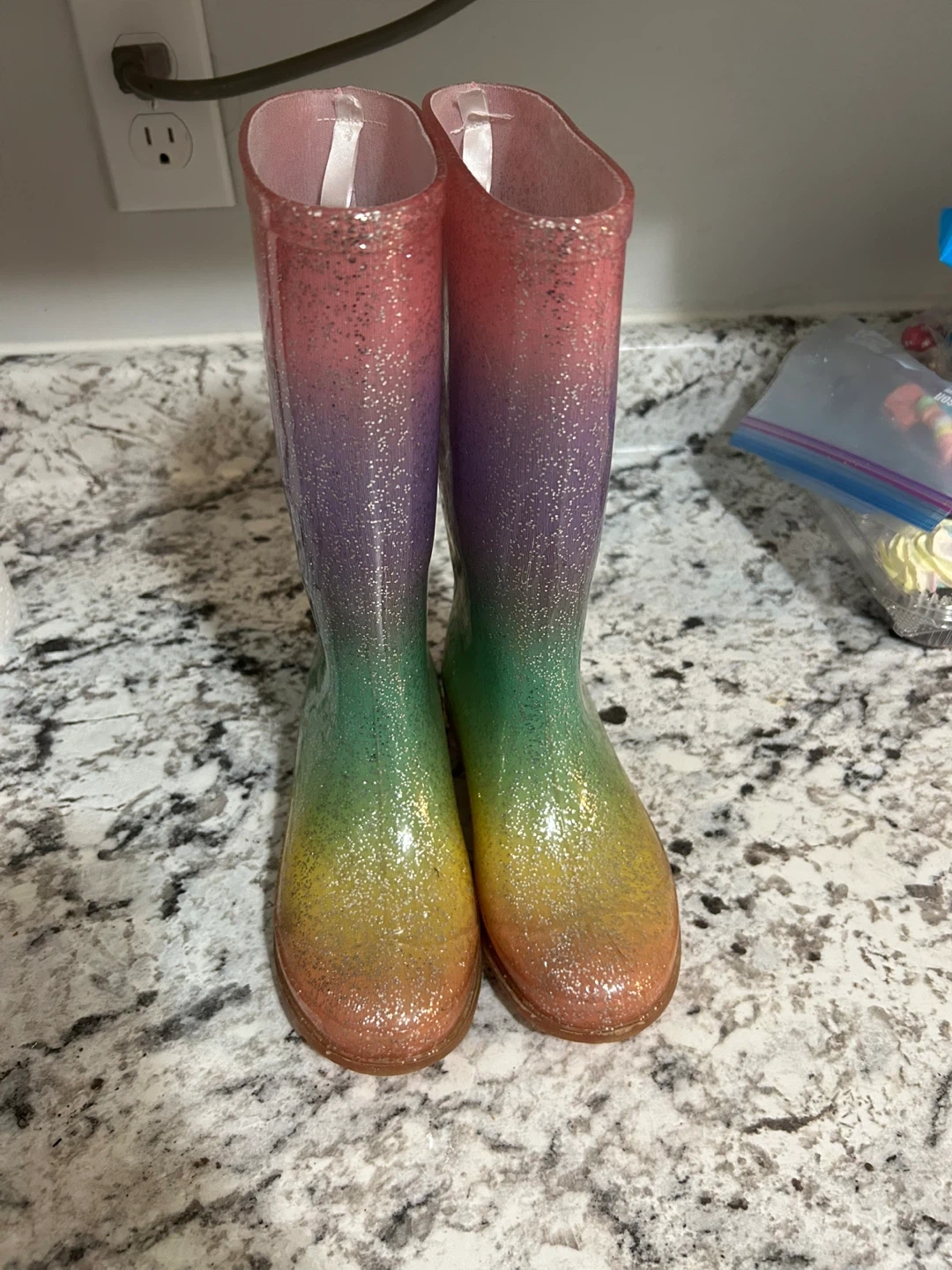 These cute rain boots feature a vibrant rainbow gradient with glitter details throughout. They're made of waterproof material, perfect for splashing in puddles. The sturdy soles offer good grip. A fun addition for any kid's rainy day adventures! Size 13