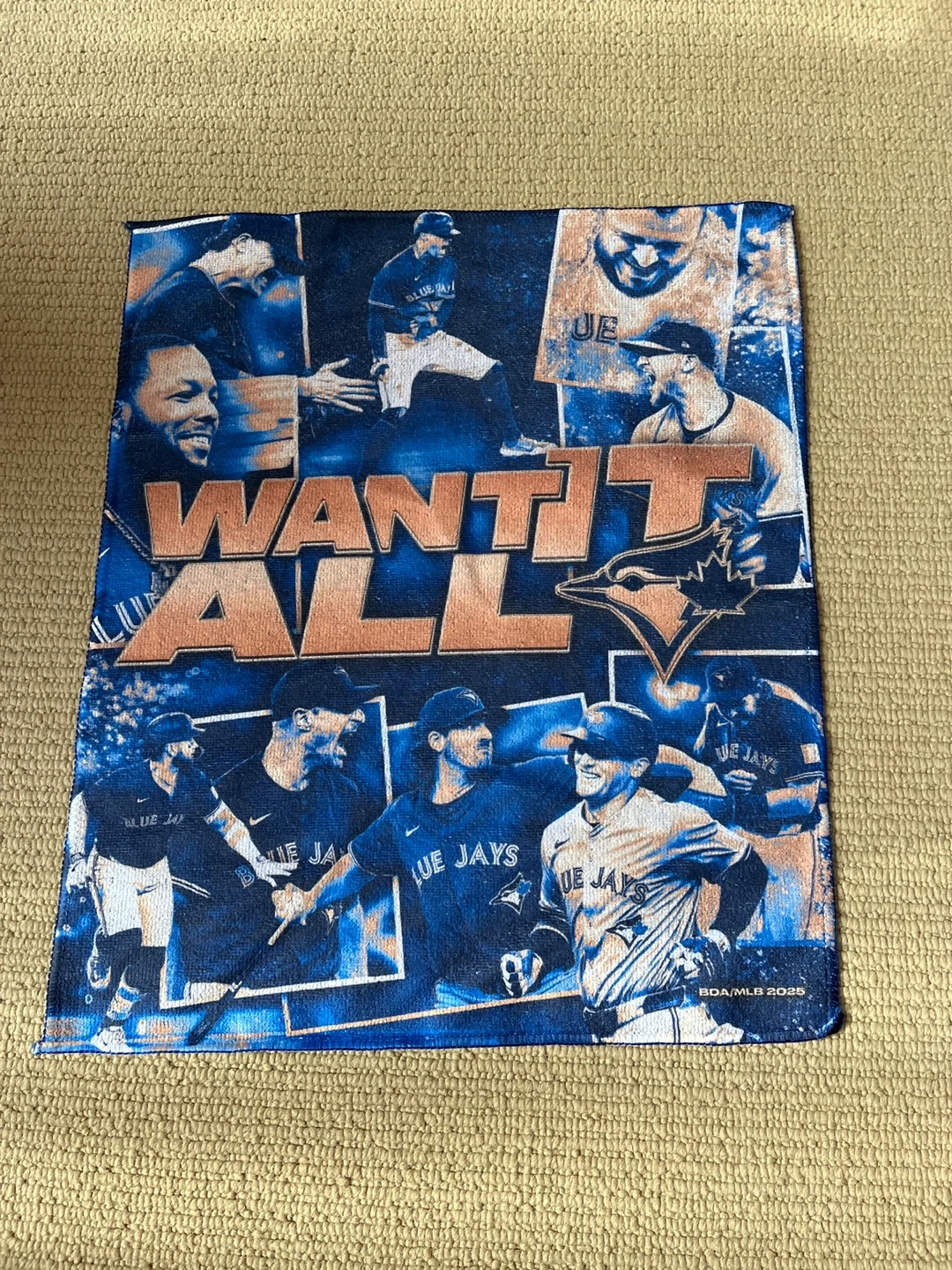 This Toronto Blue Jays towel features "Want It All" text and images of players. It's made of a soft fabric. A great item for any Blue Jays fan!