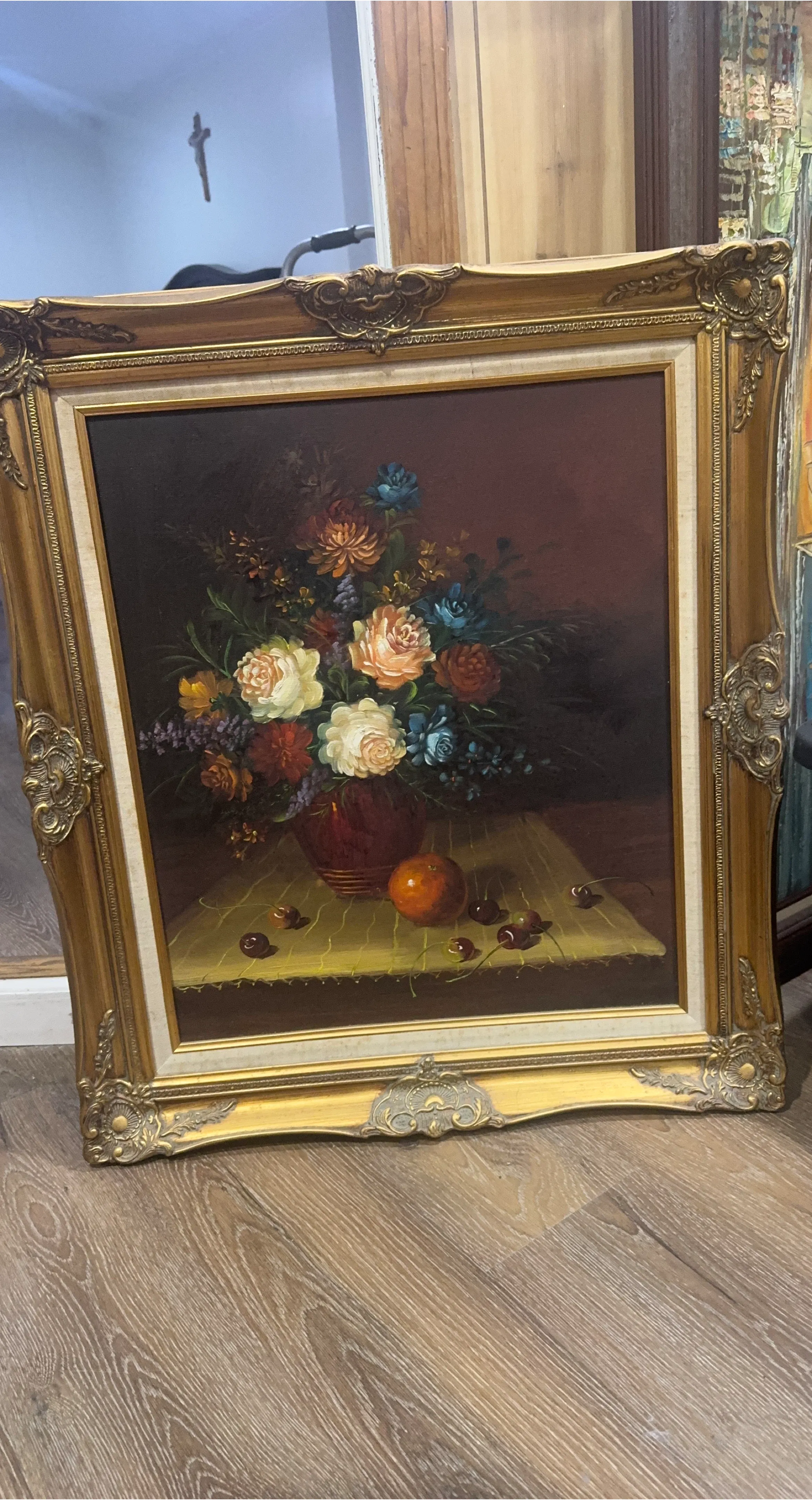 This is an oil painting of a floral arrangement in a vase, with an orange and cherries on a table. It's framed with an ornate gold-colored wood frame. The painting has a rich, classic look.