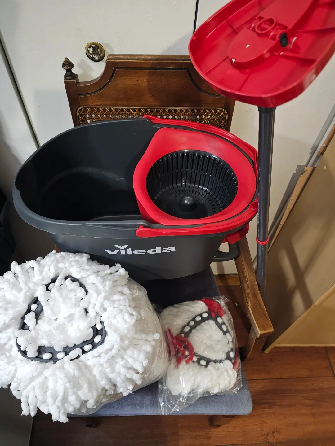 This Vileda Spin & Sparkle mop set comes with a bucket and handle. It includes one mop head attached to the handle and one extra mop head in packaging. Microfibre mop head for effective cleaning.