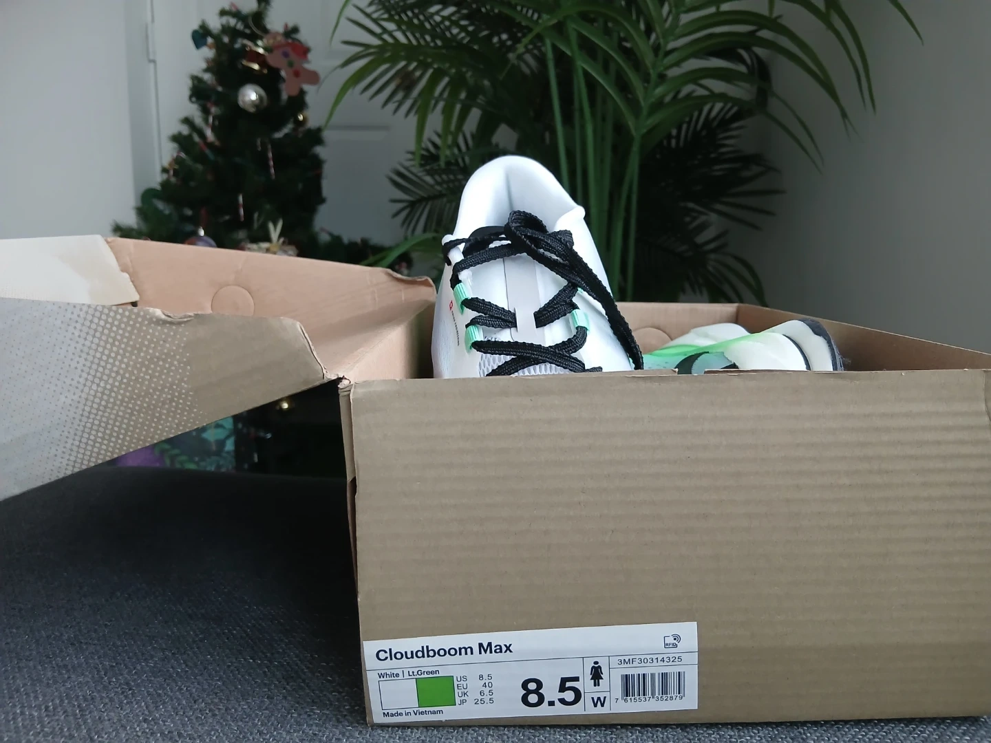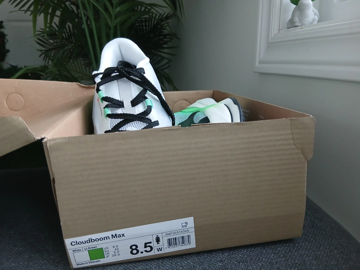 These On Running Cloudboom Max shoes are designed for performance. They feature a white and green colourway with black accents. The size is 8.5 Women's. This pair comes with its original box.