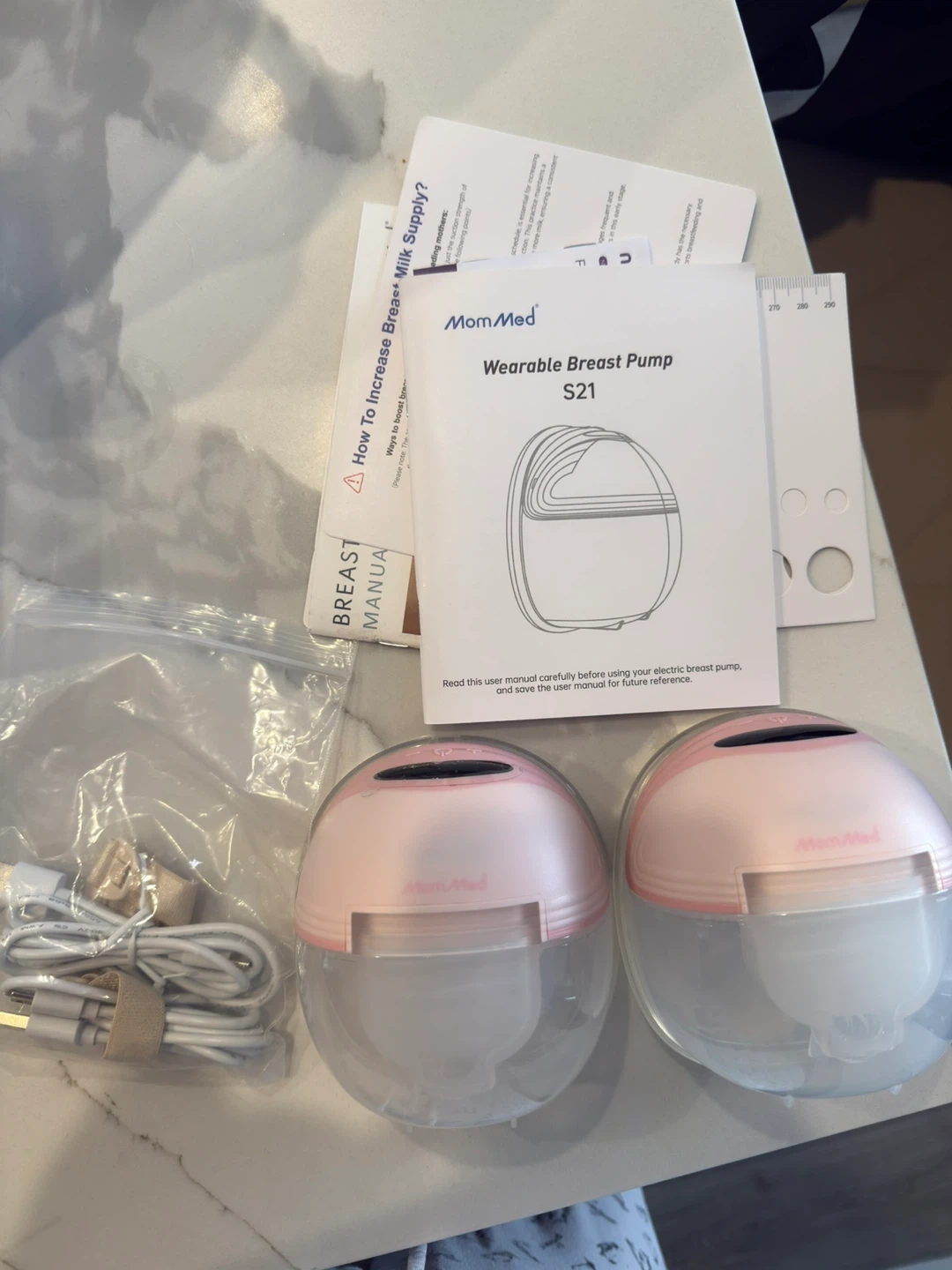 This is a pair of MomMed S21 wearable breast pumps. Includes USB charging cable and user manual. These pumps are pink and designed for discreet wear.