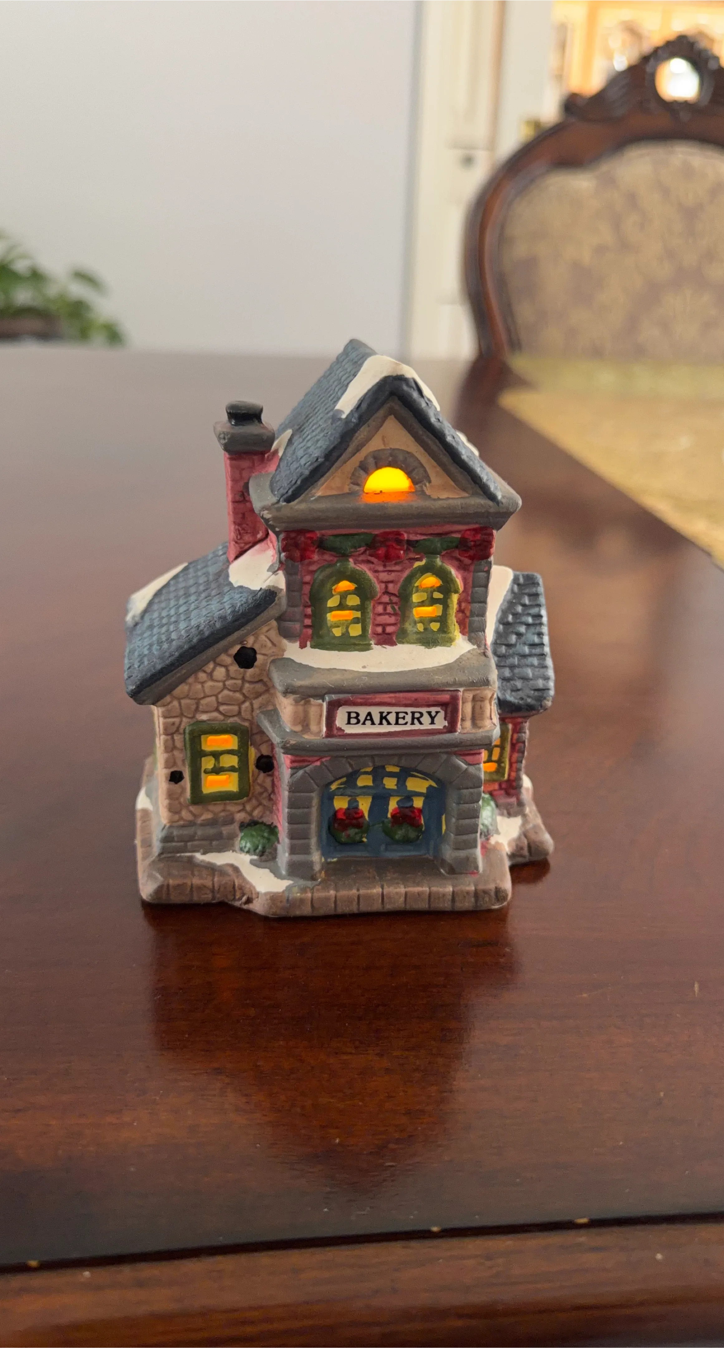 This charming ceramic village house is designed to look like a bakery. It features interior lights that glow warmly, creating a cozy atmosphere. Its detailed exterior, complete with snow accents and festive wreaths, makes it a lovely addition to any holiday display.