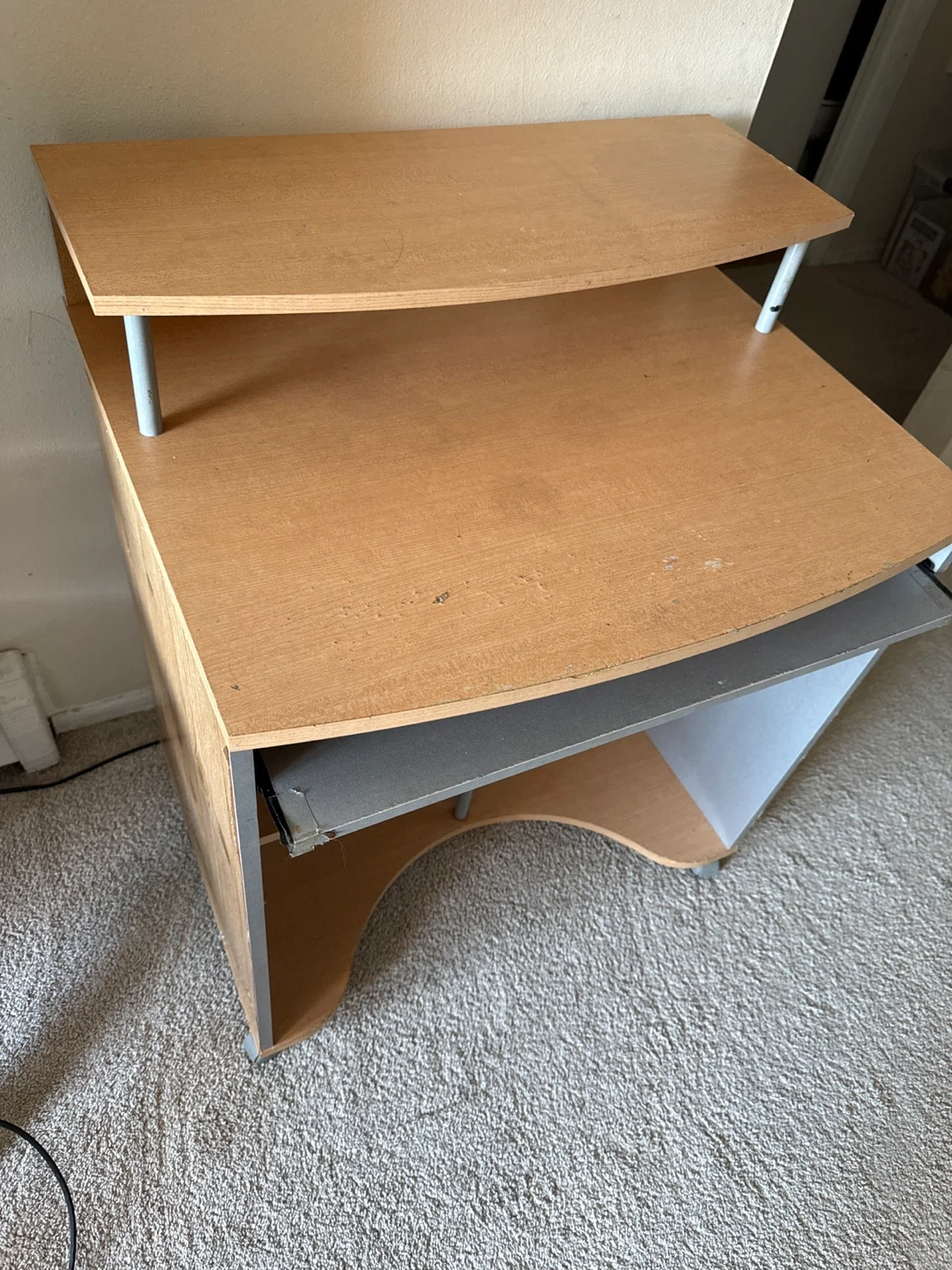 This computer desk features a natural wood finish and a raised shelf for additional storage or display. It includes a pull-out keyboard tray. The desk is made of particle board and metal supports. It's a functional piece for a home office setup.
