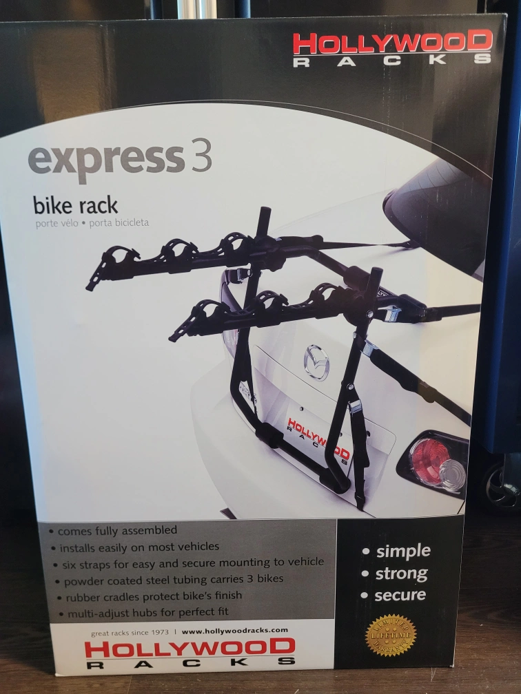 Selling a like-new Hollywood Racks Express 3 bike rack! It comes fully assembled and installs easily on most vehicles. It features six straps for easy and secure mounting to your vehicle, powder-coated steel tubing, and multi-adjust hubs for a perfect fit. It's simple, strong, and secure, and can carry 3 bikes. Box included!