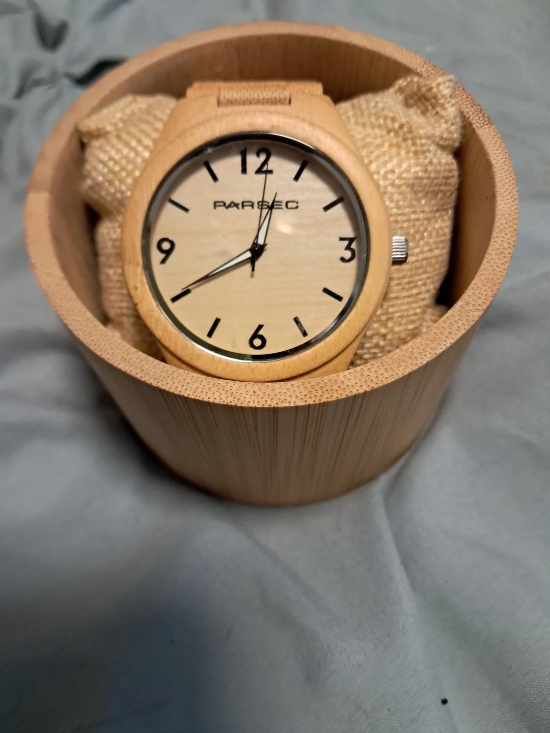 This PARSEC watch features a natural bamboo casing and band. It comes with extra links and pins for adjustment. The watch face has a clean, minimalist design.
