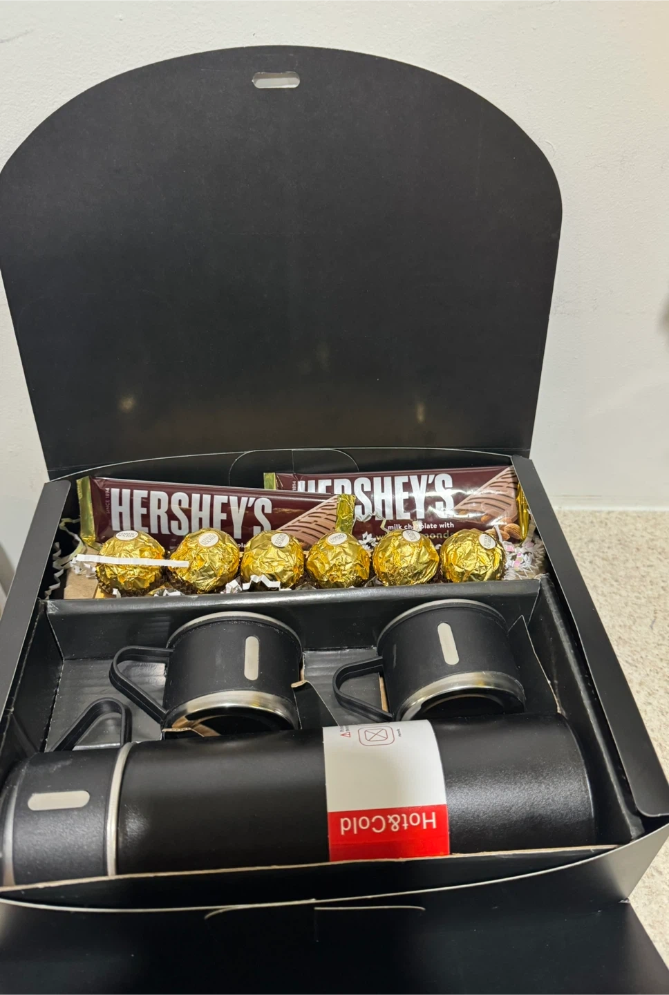 This gift set includes two Hershey's chocolate bars, several Ferrero Rocher chocolates, two mugs, and a black thermos. The thermos is labeled "Hot & Cold". It's a nice assortment for a chocolate and beverage lover!