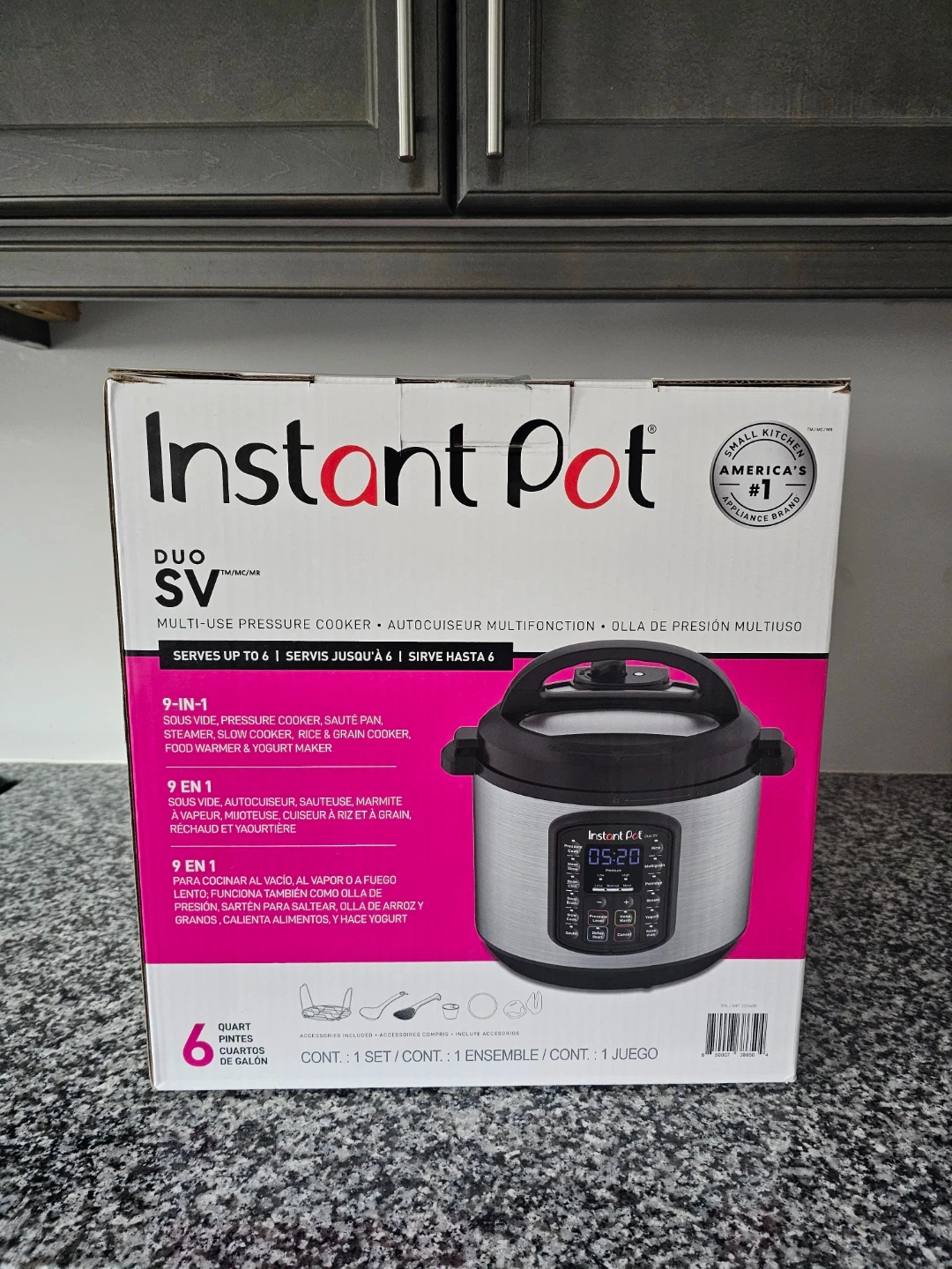 This Instant Pot Duo SV is a 6-quart, 9-in-1 multi-use pressure cooker. It serves up to 6 people and has functions for pressure cooking, slow cooking, sautéing, steaming, and more. Its stainless steel inner pot is durable and easy to clean.