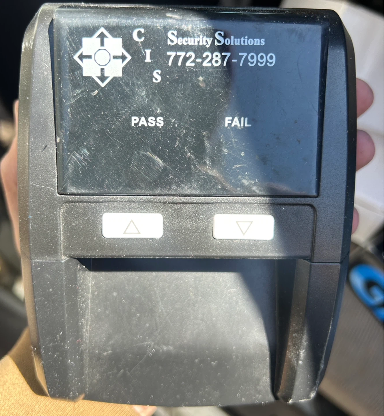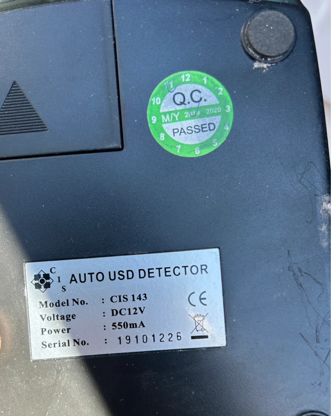 This C I S Auto USD Detector is a CIS 143 model. It operates on DC12V and requires 550mA. The serial number is 19101226. It has pass and fail indicators.