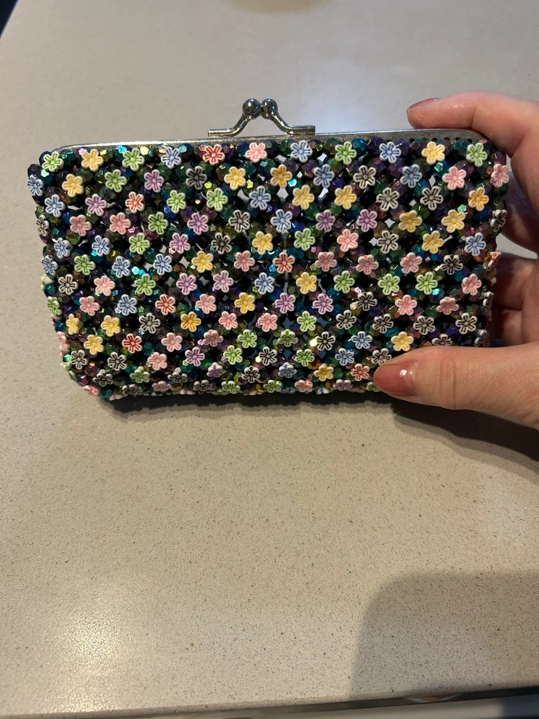 This is a fun beaded clutch purse with a colourful floral design and a kiss-lock closure. It's perfect for a night out or special occasion!