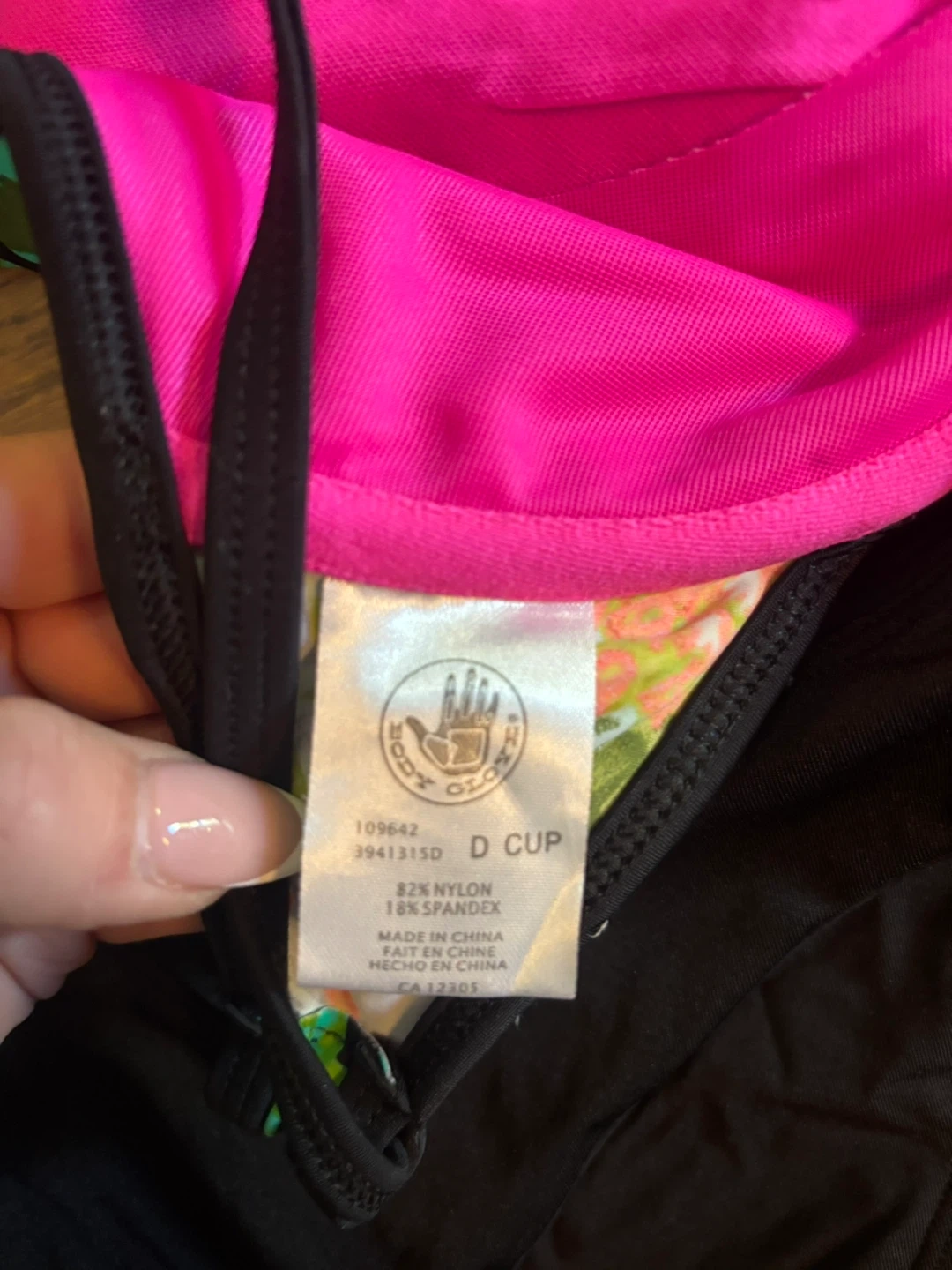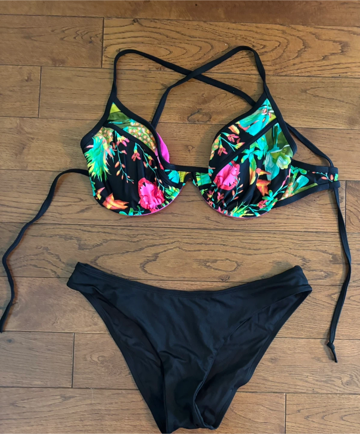 This two-piece bikini set features a vibrant floral print on the bra and solid black bottoms. The bra is a D cup size and the bottoms size medium It's perfect for your next beach vacation or poolside lounging!