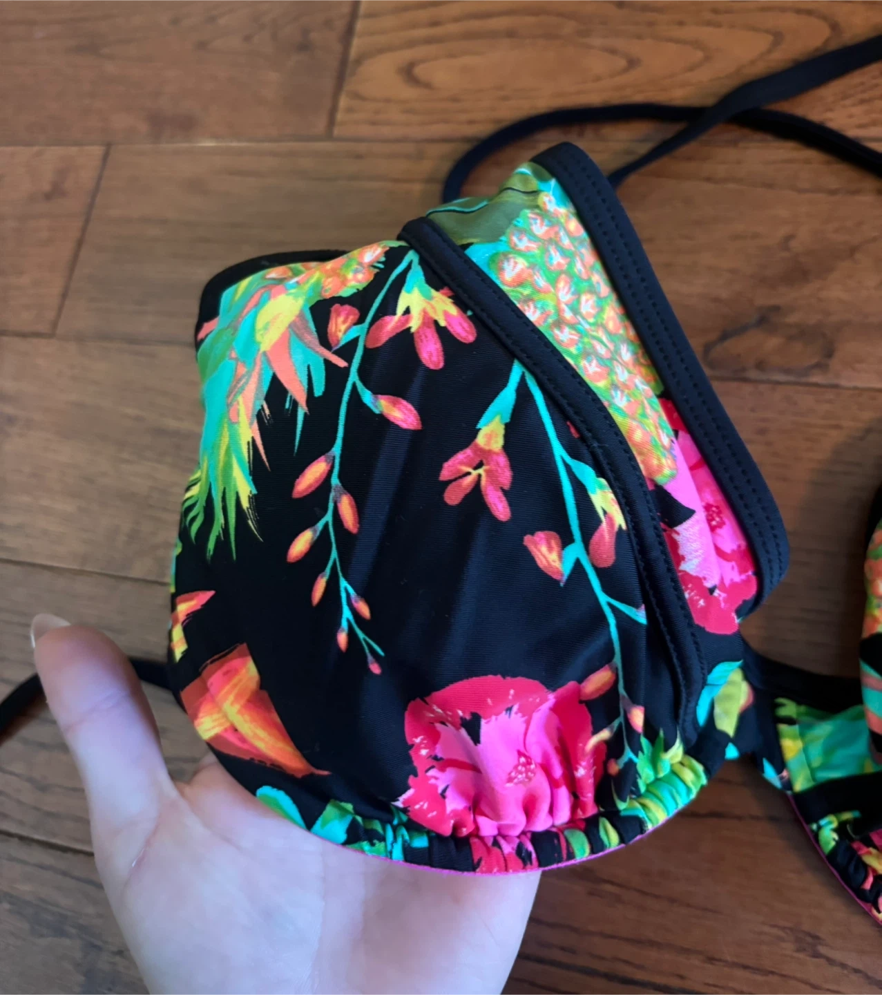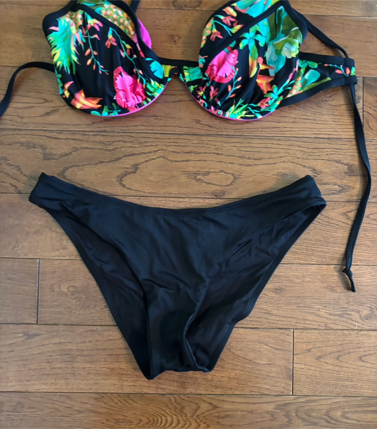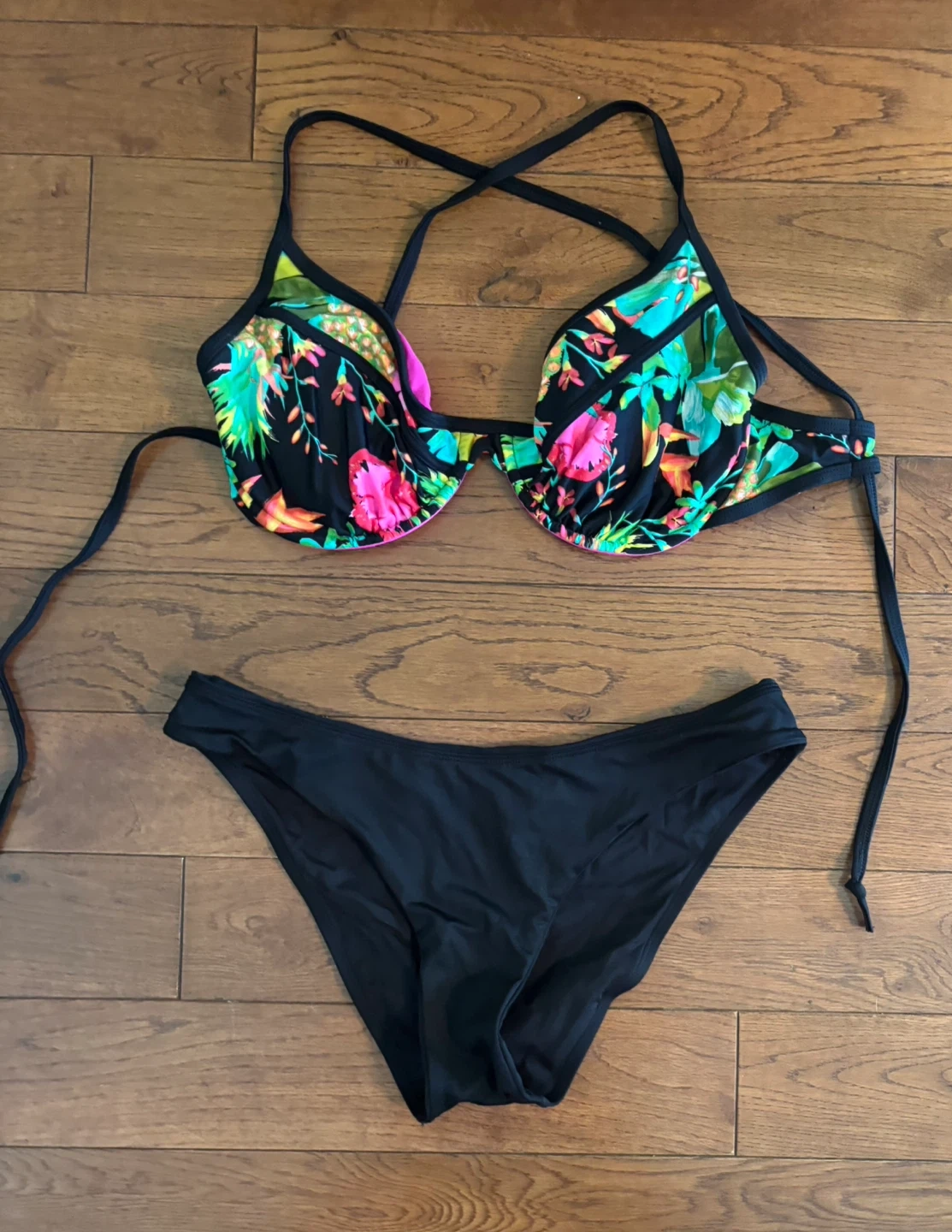 This two-piece bikini set features a vibrant floral print on the bra and solid black bottoms. The bra is a D cup size and the bottoms size medium It's perfect for your next beach vacation or poolside lounging!