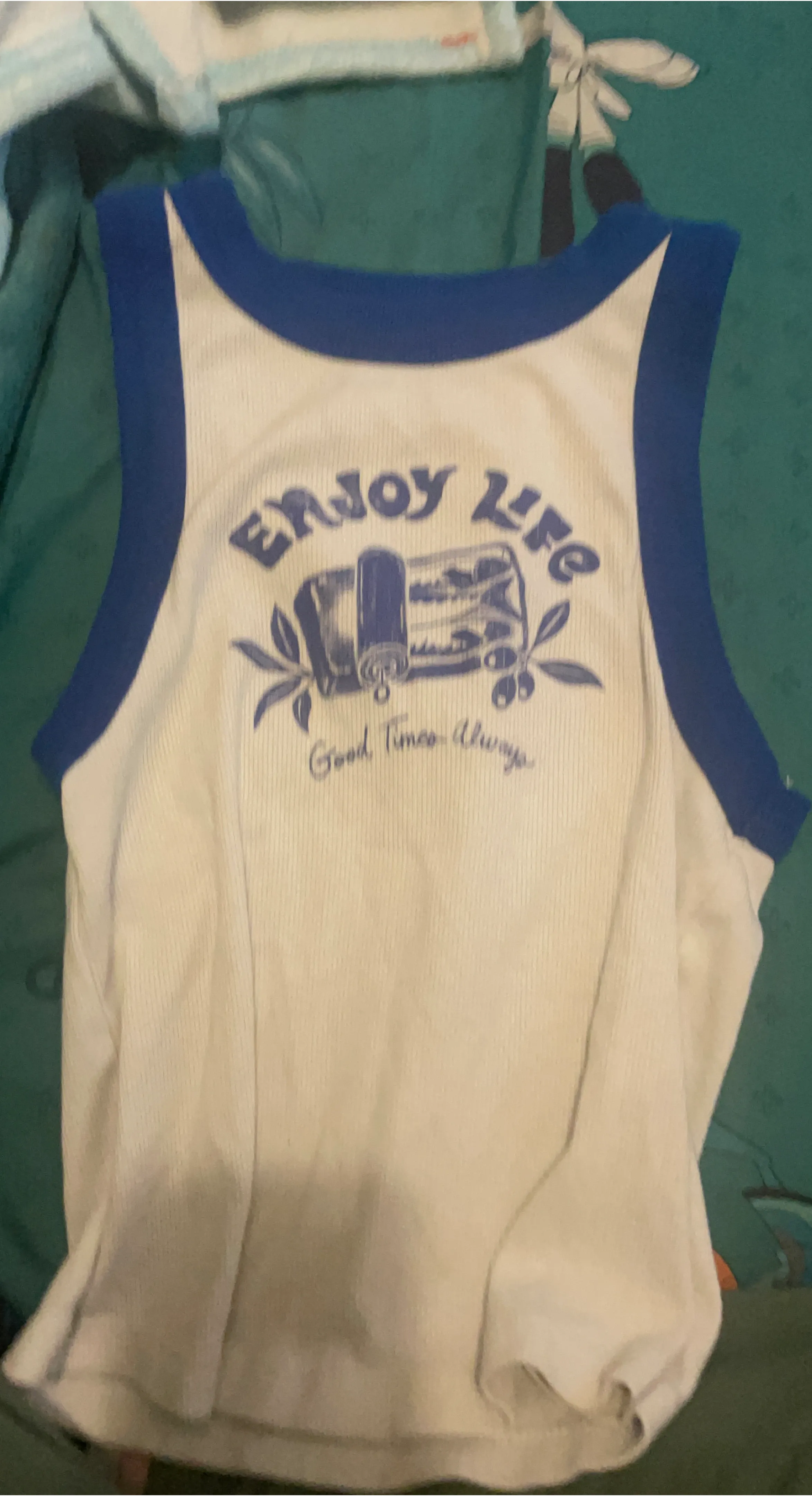 This is a white ribbed tank top with blue trim. It features a graphic that says 'Enjoy Life' and 'Good Times Always'. The material is soft and comfortable.