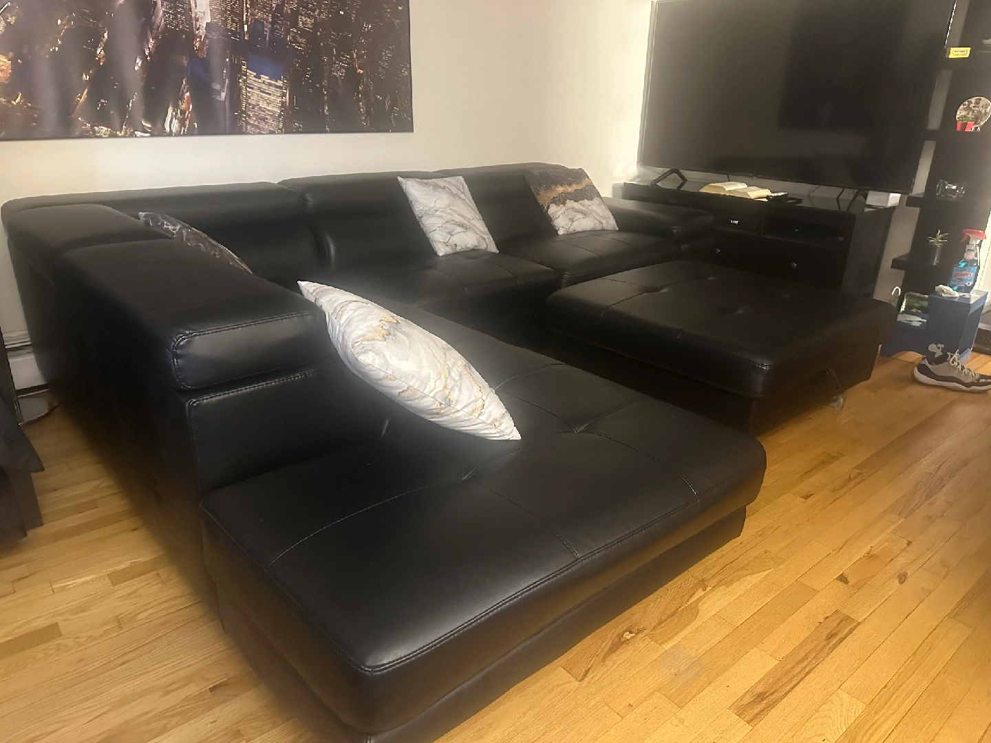Selling a comfortable black leather sectional sofa that includes an ottoman. It's in good condition and ready to add some style to your living room. The sectional design offers plenty of seating space, and the ottoman provides extra comfort and versatility,,ottoman also serves as a storage and the sofa's also have 3 storage compartments behind headrests