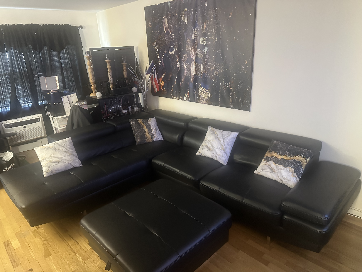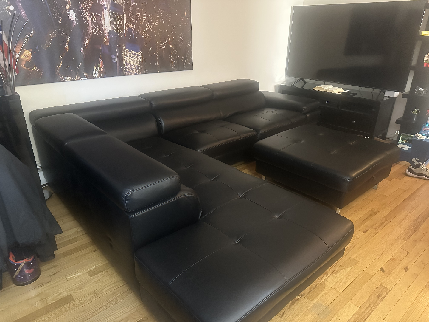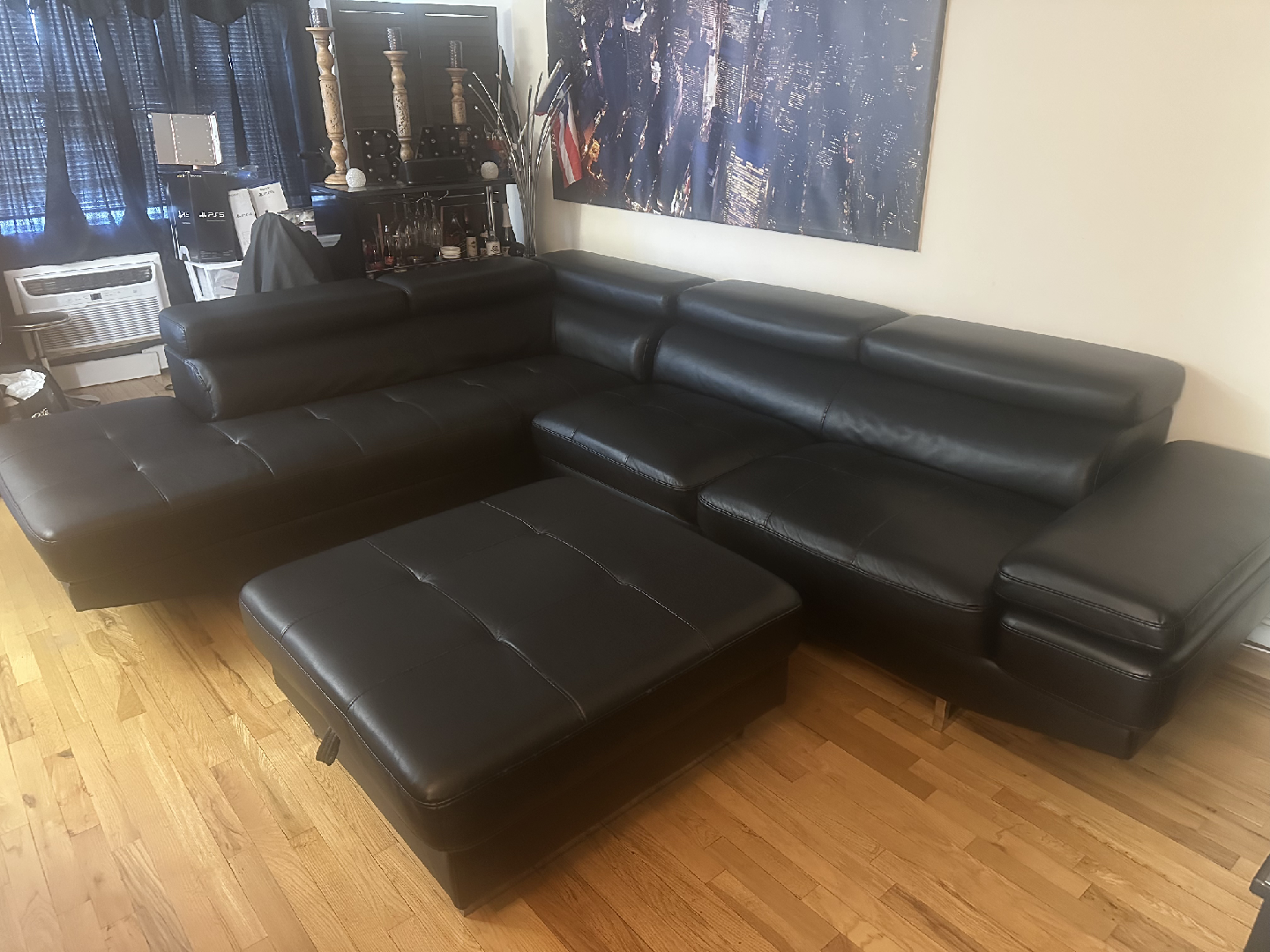 Selling a comfortable black leather sectional sofa that includes an ottoman. It's in good condition and ready to add some style to your living room. The sectional design offers plenty of seating space, and the ottoman provides extra comfort and versatility,,ottoman also serves as a storage and the sofa's also have 3 storage compartments behind headrests