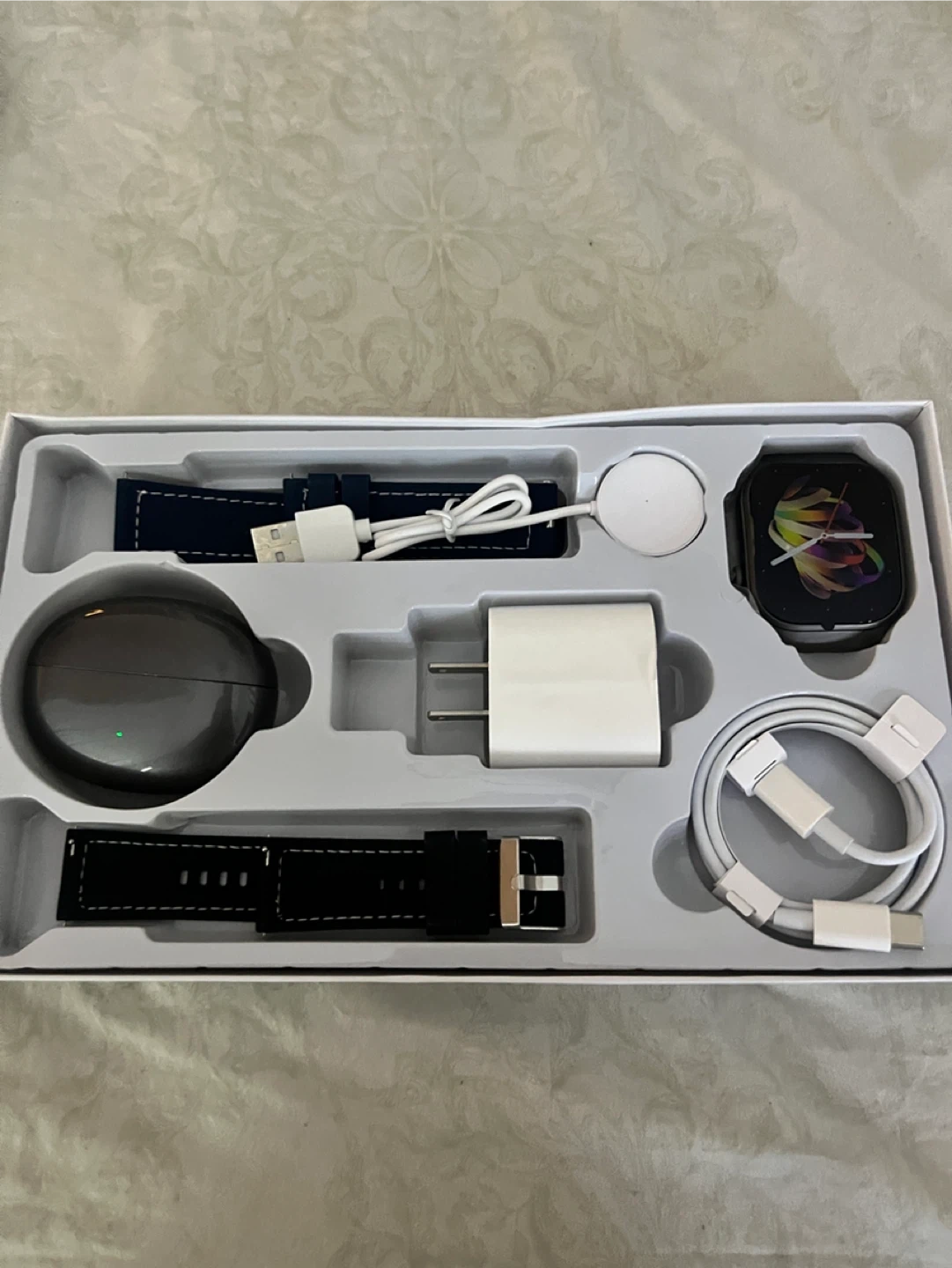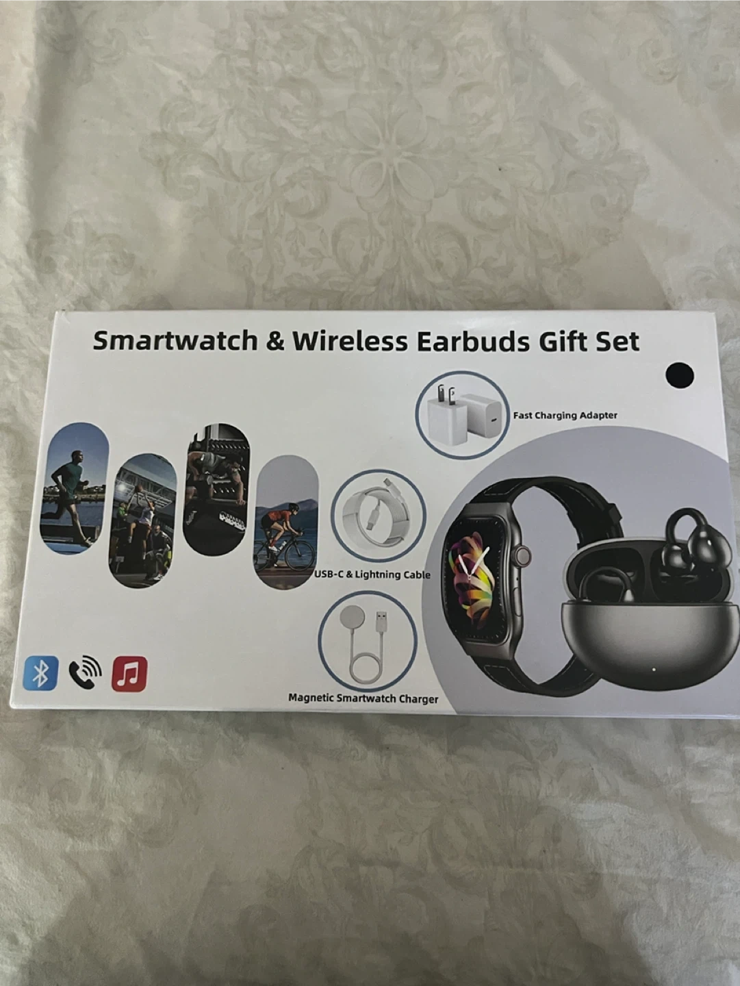 This gift set includes a smartwatch and wireless earbuds. It comes with a fast charging adapter, USB-C & Lightning cable, and a magnetic smartwatch charger. Two watch straps are also included.