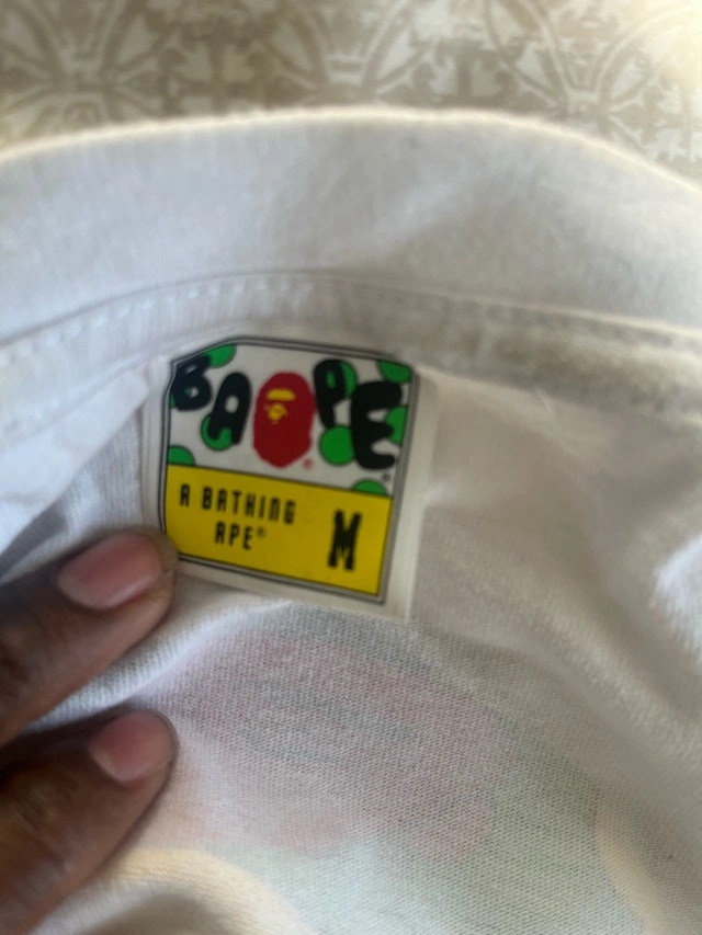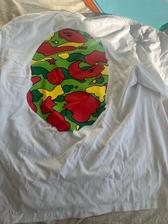 This is a BAPE T-shirt, featuring a vibrant camo design that’s sure to turn heads. The shirt is in used condition, but it has been well taken care of. Key Features: - Brand: BAPE (A Bathing Ape) - Size: Medium - Design: Iconic BAPE camo print. Good condition.