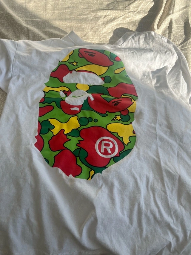 This is a BAPE T-shirt, featuring a vibrant camo design that’s sure to turn heads. The shirt is in used condition, but it has been well taken care of. Key Features: - Brand: BAPE (A Bathing Ape) - Size: Medium - Design: Iconic BAPE camo print. Good condition.