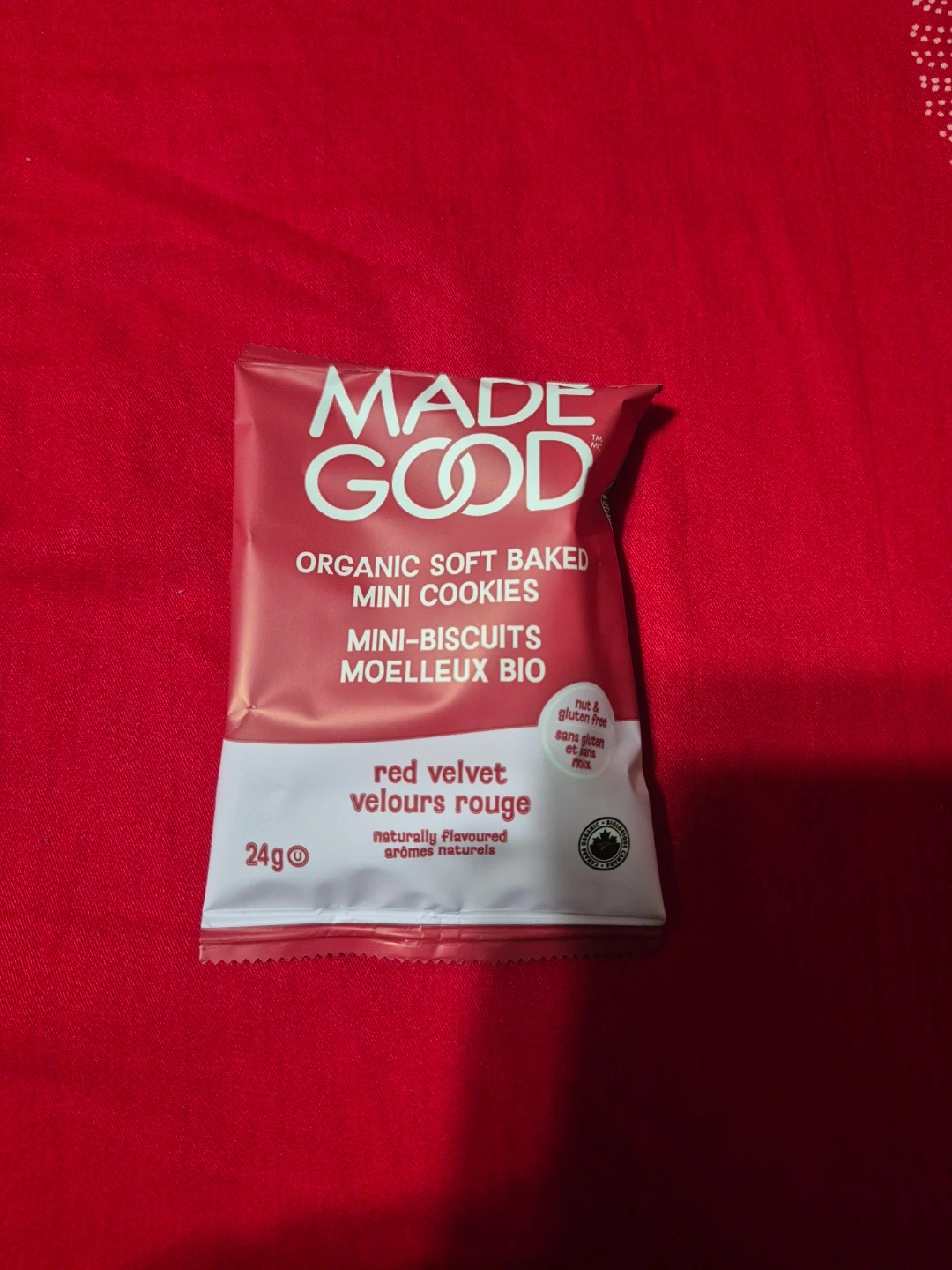 These are Made Good organic soft baked mini cookies in red velvet flavour. They are nut and gluten-free. 24g package.