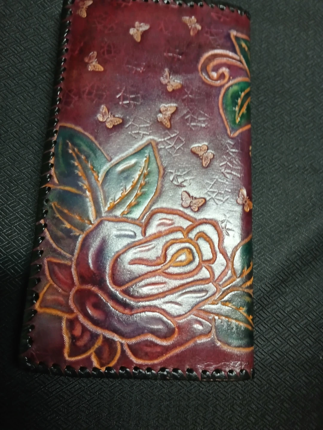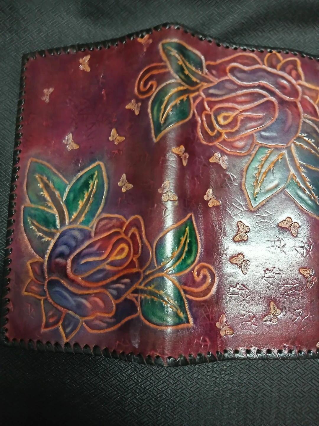 Check out this unique handmade leather wallet! It features a beautiful floral design with roses and butterflies. The wallet is in great condition and has a snap closure. Located near Lynne valley exit