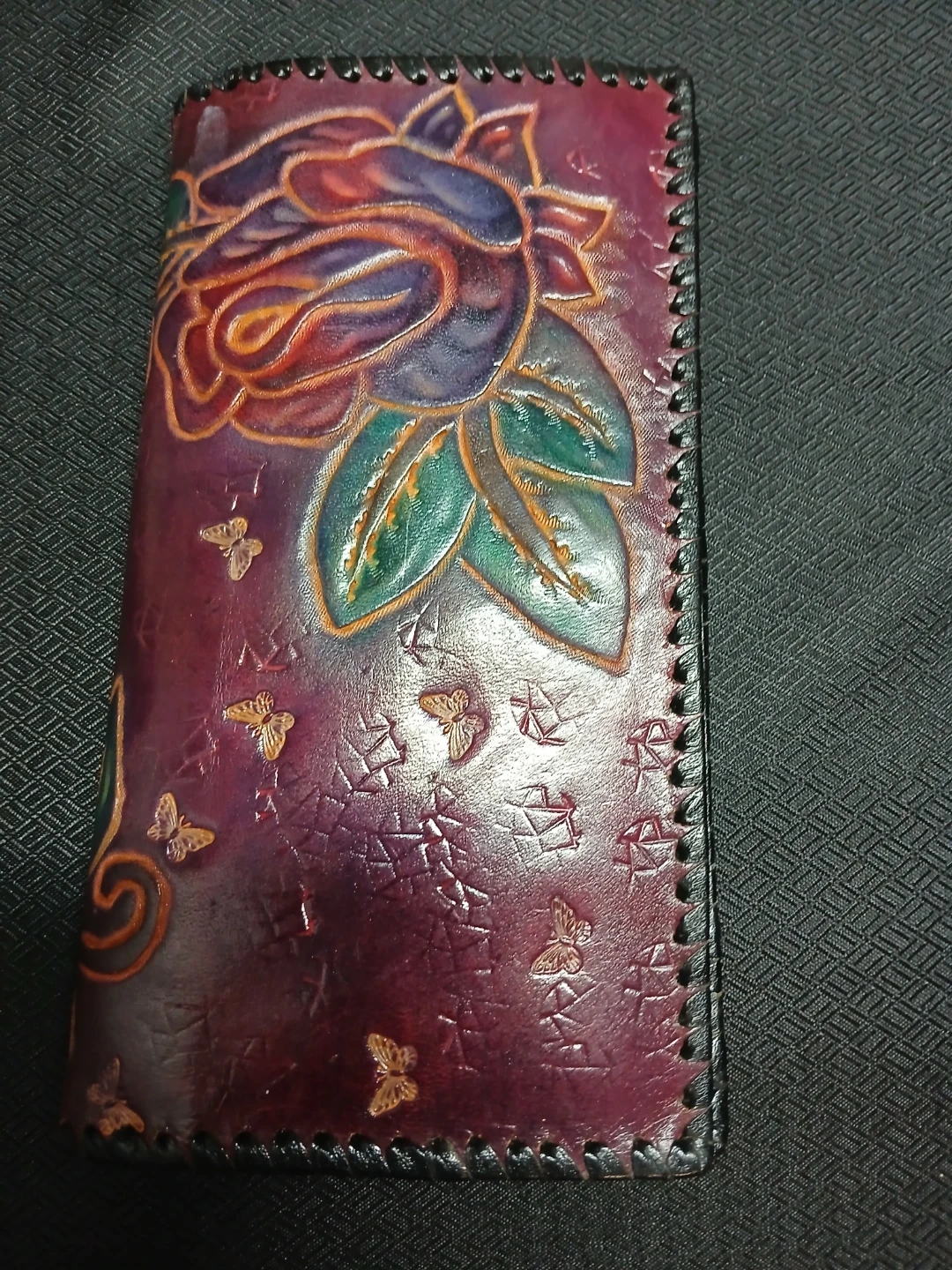 Check out this unique handmade leather wallet! It features a beautiful floral design with roses and butterflies. The wallet is in great condition and has a snap closure. Located near Lynne valley exit