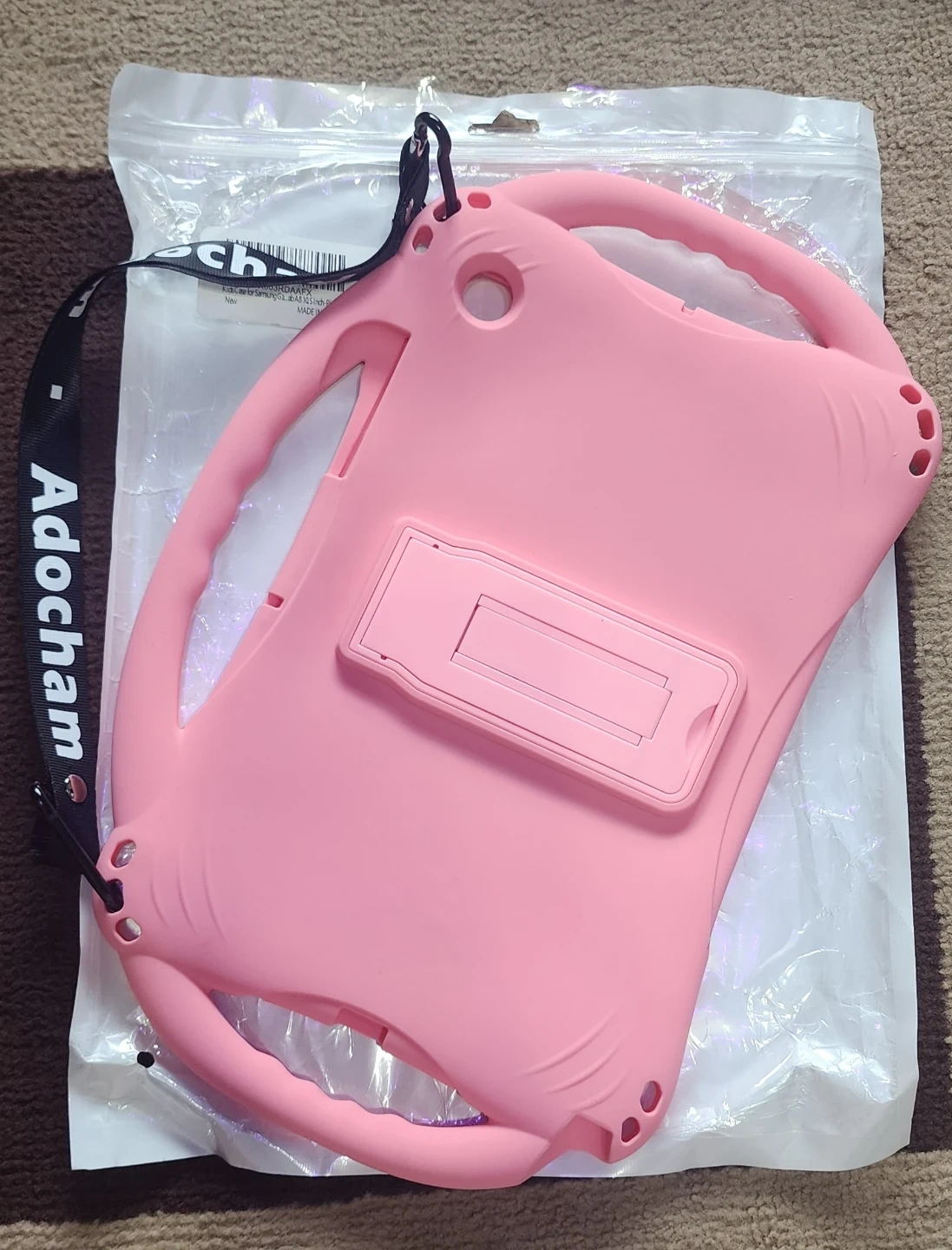 Selling a kid case for samsung A8 10.5 inch pink silicone material and built-in handle. It features a stand for easy viewing. Protects tablets from drops and bumps!