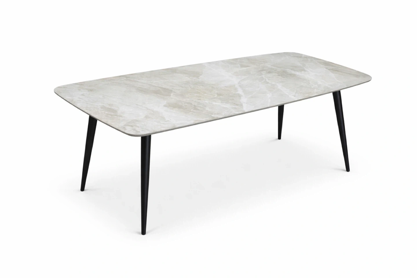 This rectangular dining table features a chic faux marble top with a subtle grey veining pattern. It's supported by sleek black metal legs, offering a contemporary look. Seats six comfortably.