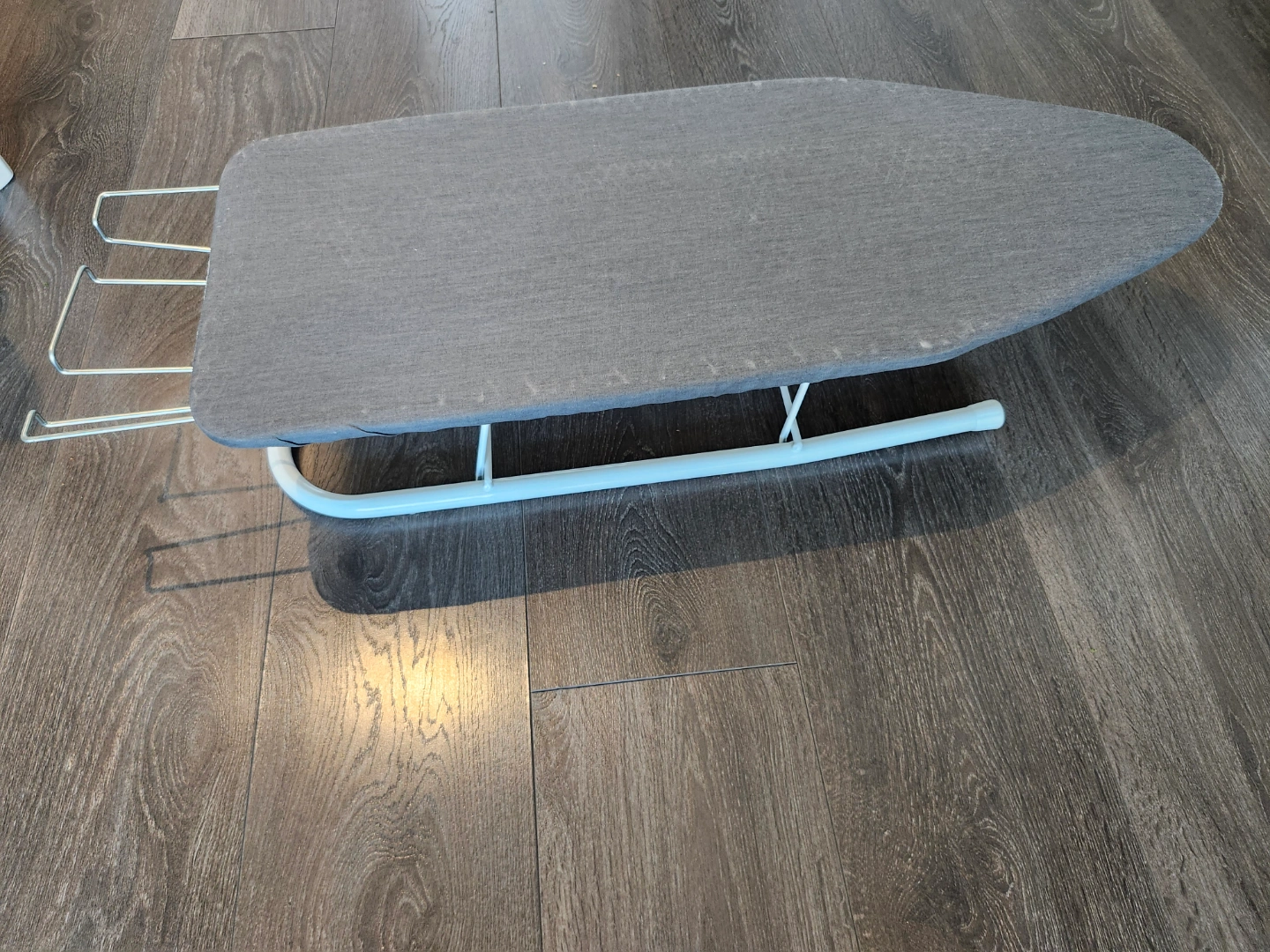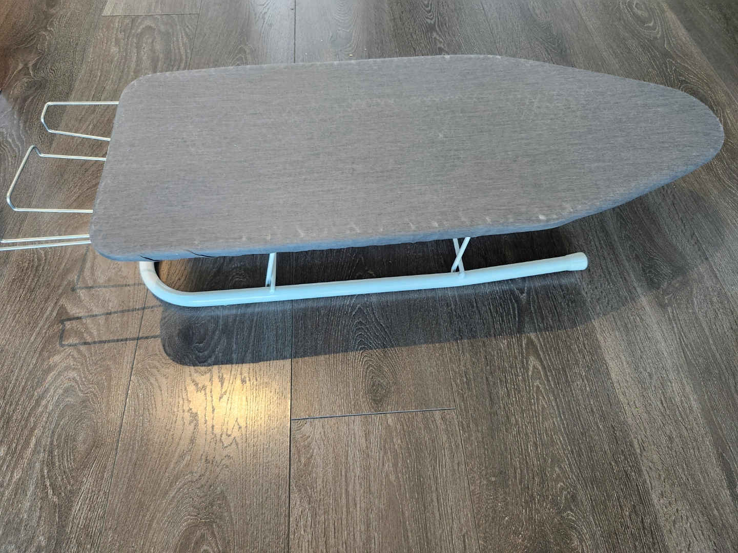Grey ironing board cover. Attached to a white metal frame. Ironing board cover shows some wear. Frame is in good condition.