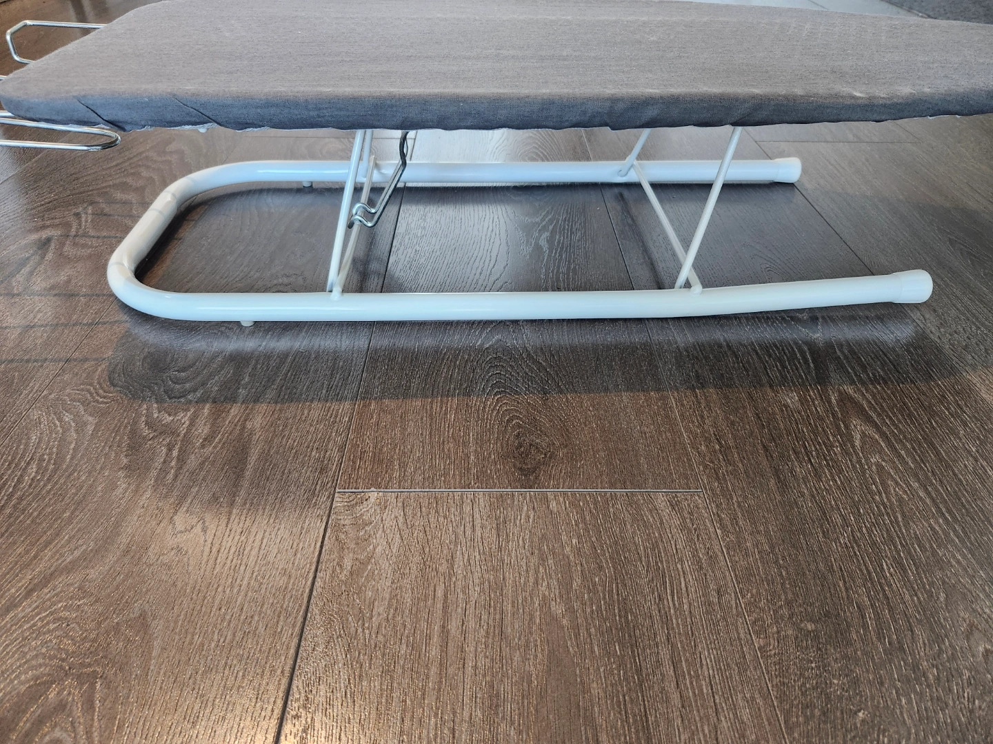 Grey ironing board cover. Attached to a white metal frame. Ironing board cover shows some wear. Frame is in good condition.