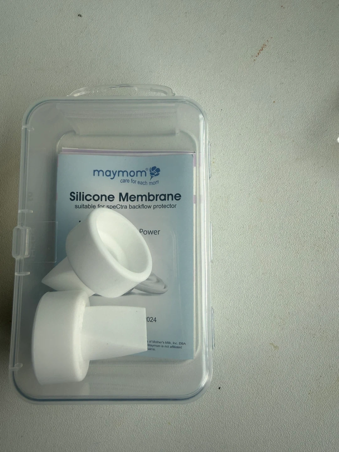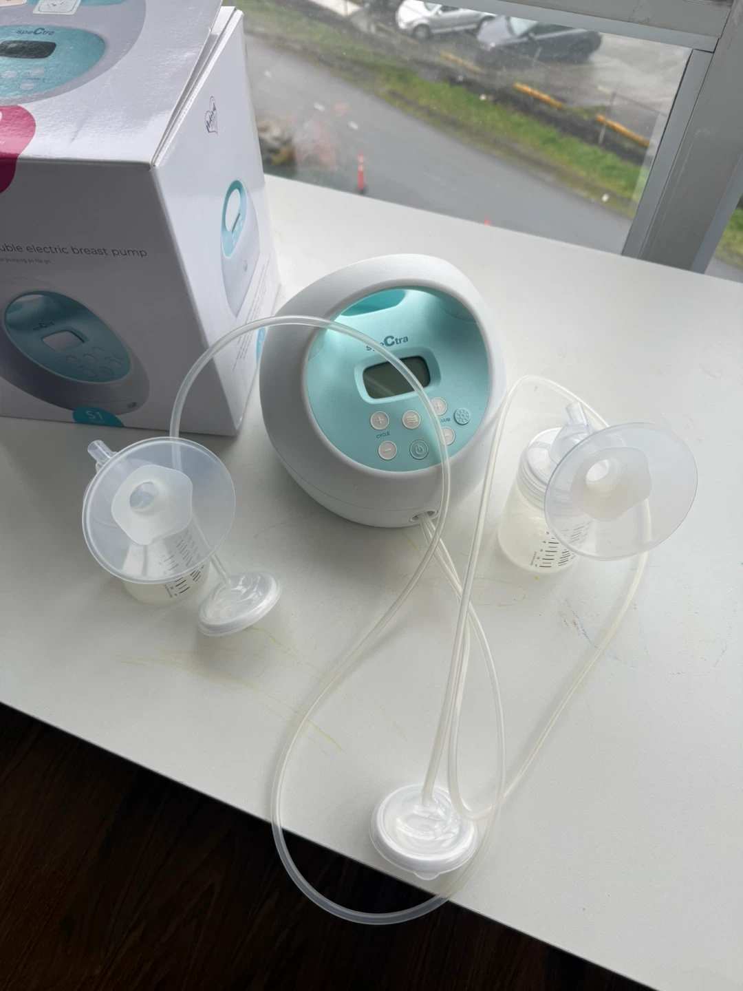 This is a Spectra S1 Plus double electric breast pump. It includes the pump, tubing, bottles, flanges, and Maymom silicone membranes and replacement tubing. All components are clean and ready for use.